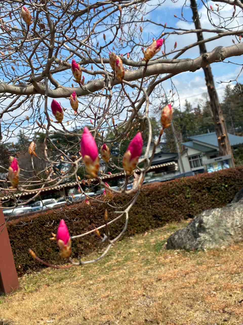 市役所正面玄関の手前にヤシオツツジがあって、さくらより早くピンクの花をつけますが、まだつぼみ。