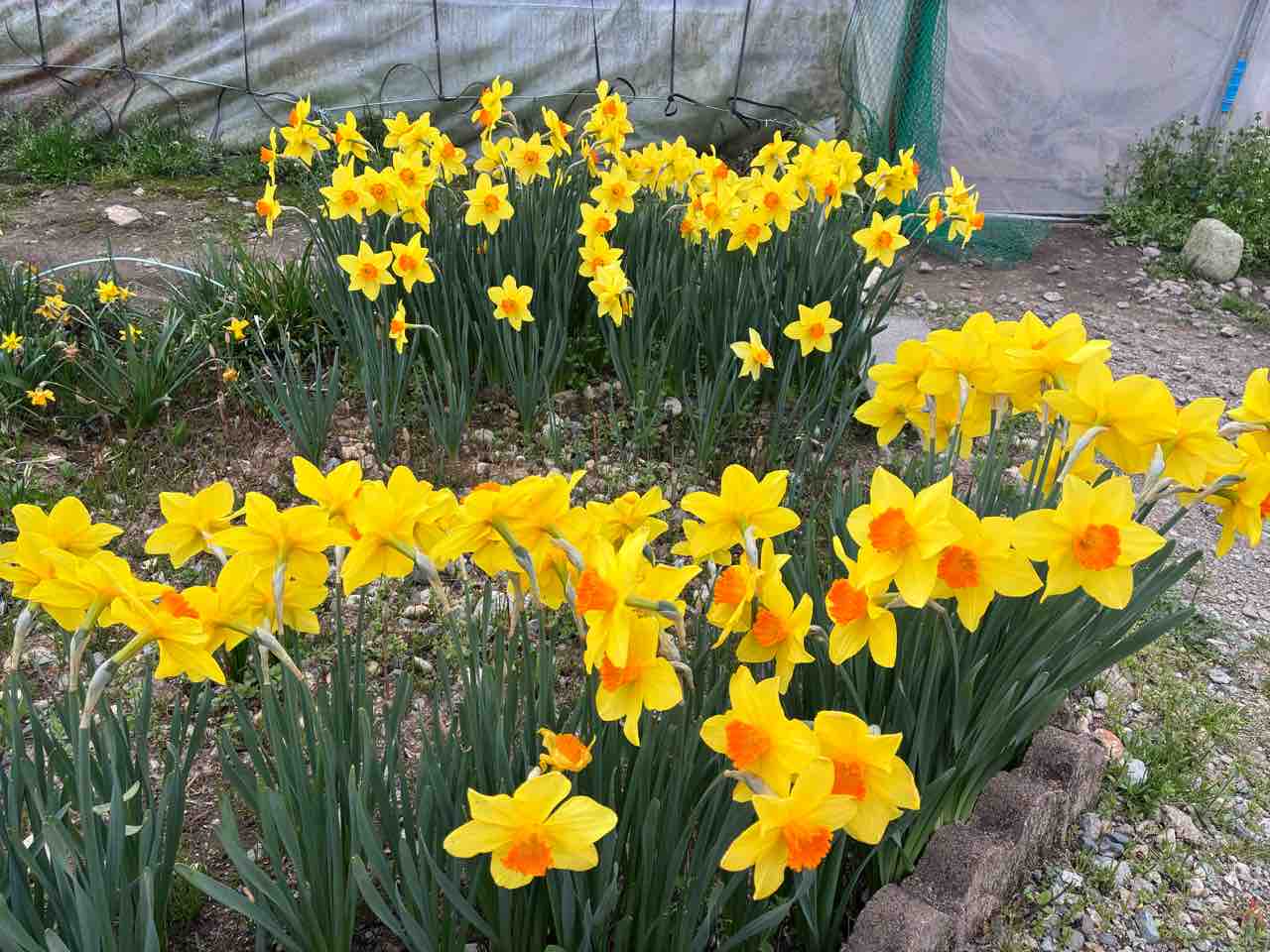 庭先や畑に咲く水仙が今きれいです。種類いろいろですが、中心が鮮やかなオレンジの黄色いラッパ水仙はよく目立っています。