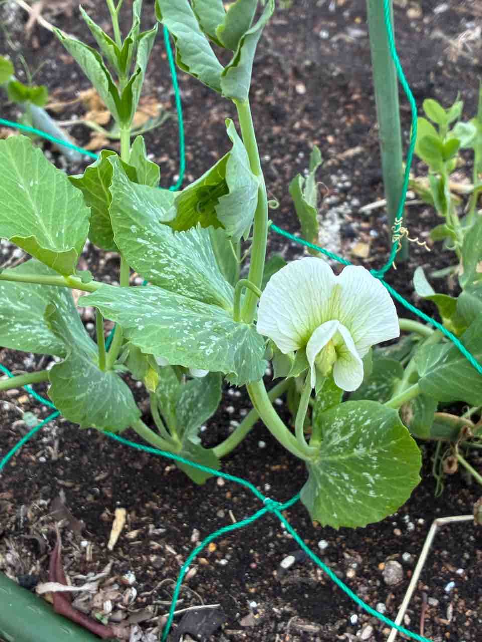 朝から風が強く、ジャガイモの葉とさやえんどうの白い花が揺れています。