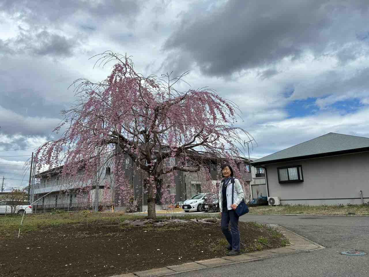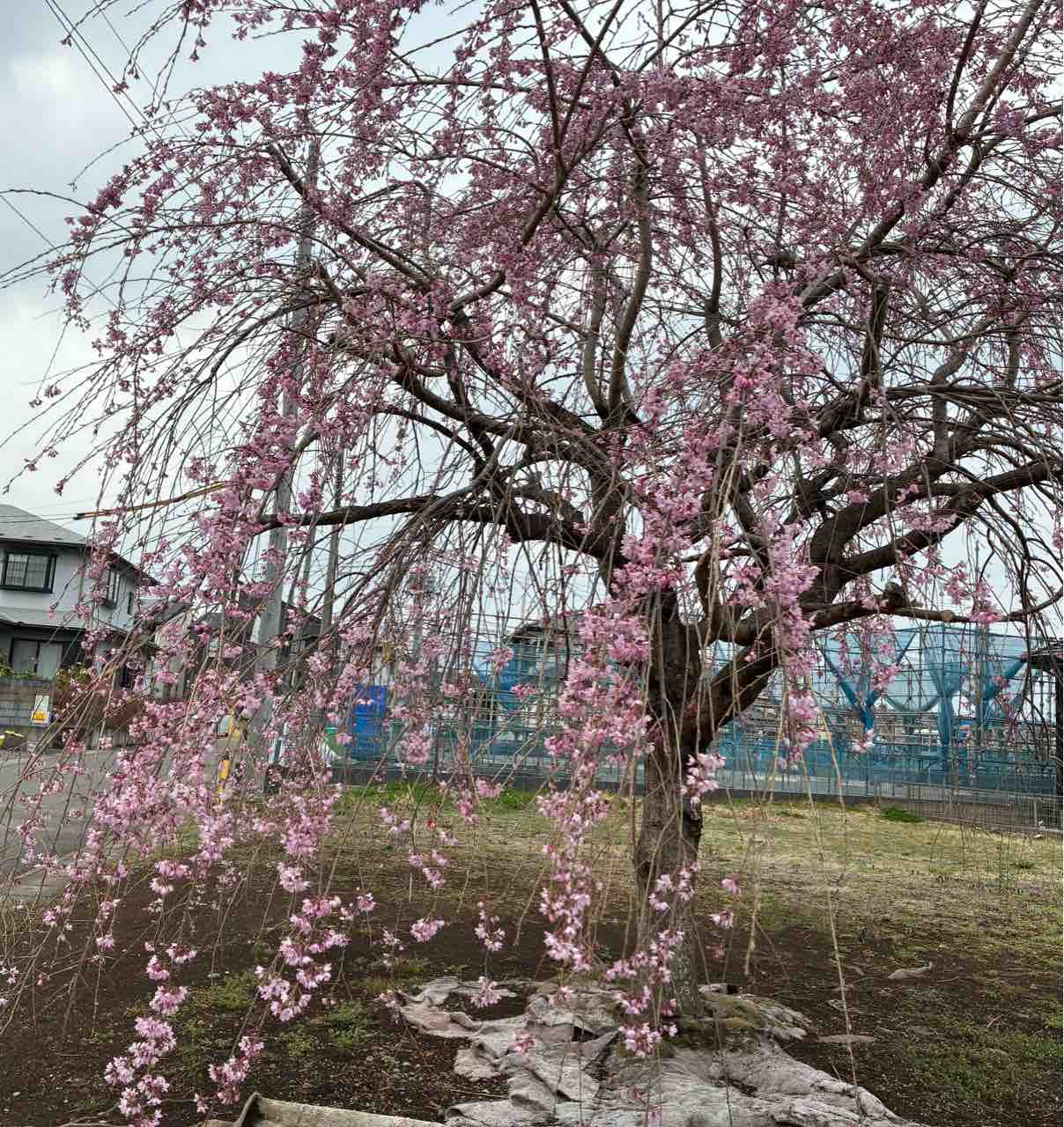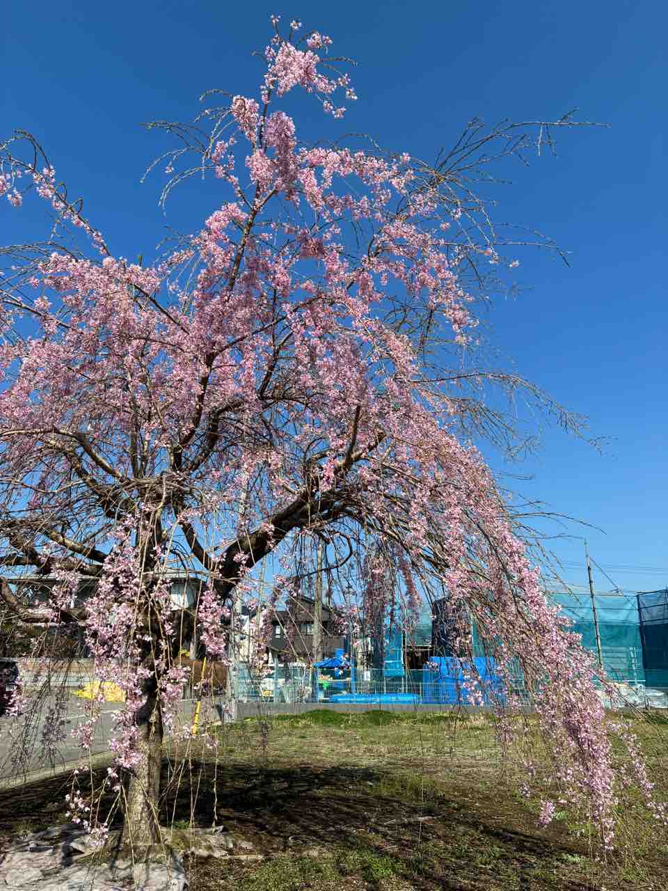 窓越しに見えているお隣の敷地にある滝桜です。日に日につぼみが膨らみ咲き始めてきています。
