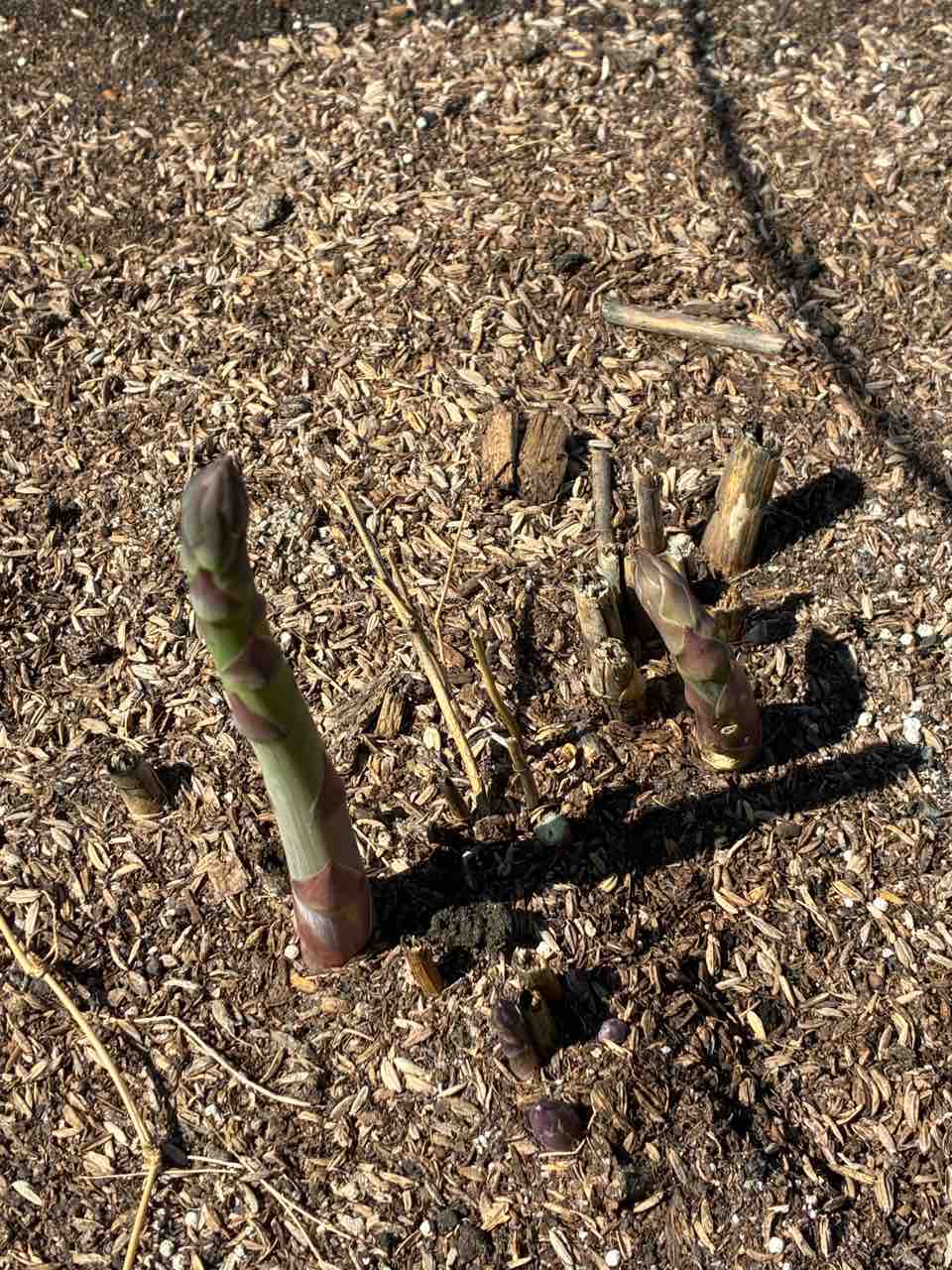 朝から風が強く、ジャガイモの葉とさやえんどうの白い花が揺れています。アスパラガスも順調に育っています。