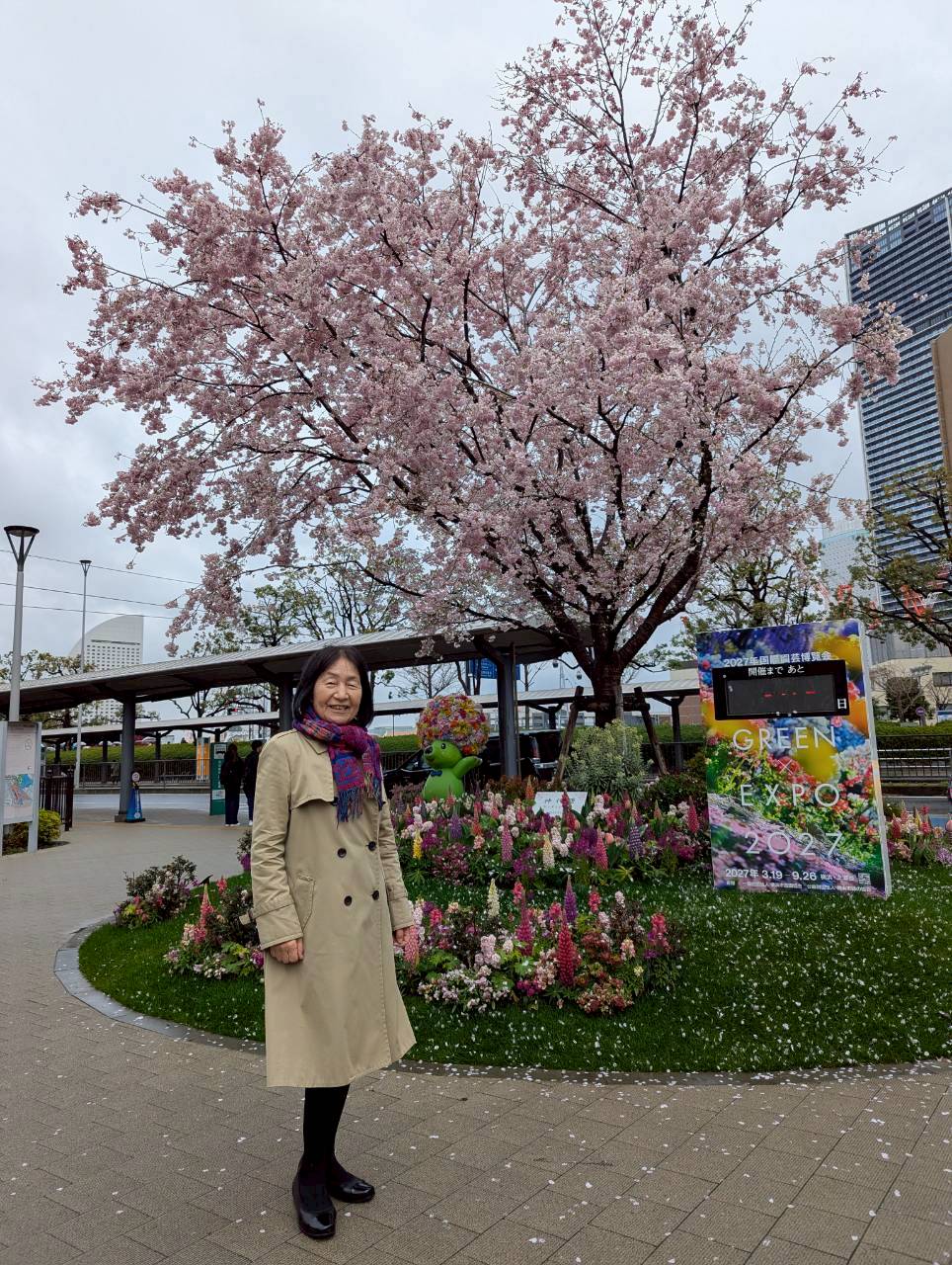 写真は横浜桜木町、来年の国際園芸博覧会の宣伝の花壇です。ここだけきれいに花開いている桜でした。