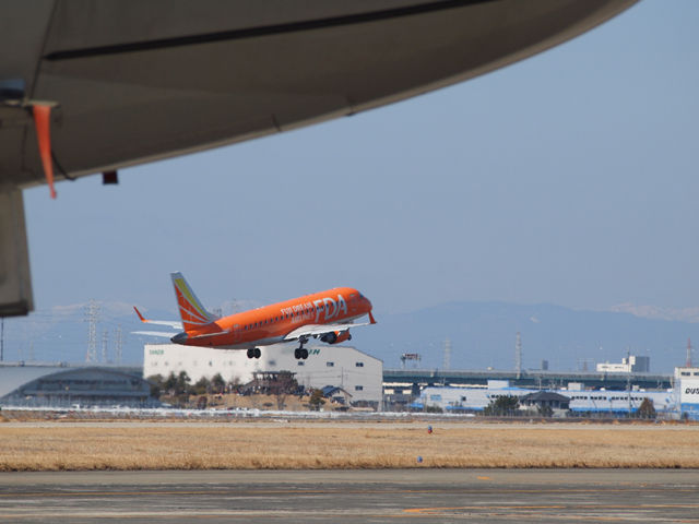 航空祭の最中でも、対面の飛行場では、普段どおりにカラフルなFDA機が発着していました。オレンジ、パープル、イエロー・・・