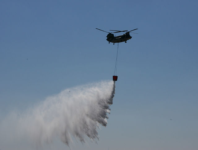CH-47J大型輸送ヘリコプターが火災現場上空から消火活動。4tの水の入ったバケットを吊り下げ、放水。