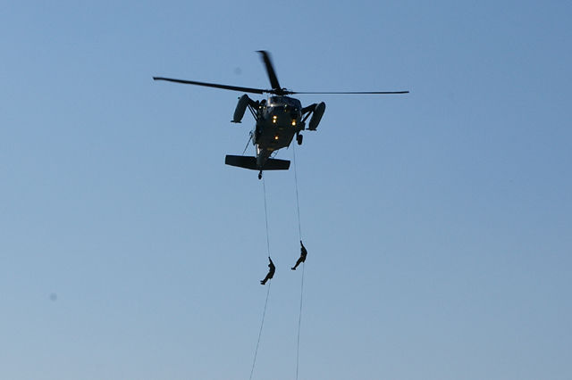 U-125A救難捜索機が要救助者を発見。UH-60Jヘリコプターが、ホバリングしながらメディック(救難員)が降下して救助に当たります。