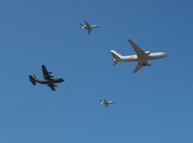 オープニングフライトは小牧基地所在の全機種による編隊飛行。上写真の先頭はKC-767(空中給油輸送機)、両脇をU-125A(救難捜索機)がエスコート、トリは4発プロペラ機のC-130H(輸送機)。