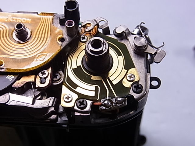 同軸上にスピードと絞りの切換ダイヤルがあり、その基板部が見えています。