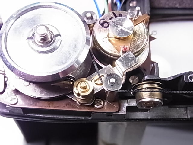 シャッターや絞りの情報は、巻き戻しノブ側にあるプーリー部で合成され、カムやレバーによって追跡指針を動かす仕組みです。