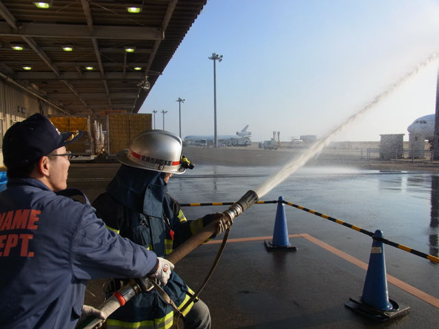 消防のコーナーでは、実際に消防服を着て、放水を体験していました。