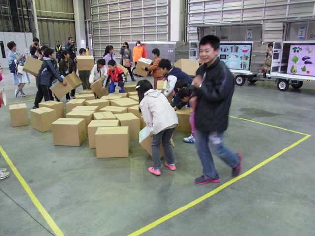 貨物の仕事体験では、ふた手に別れ、図柄が描かれた箱を決められた場所に収めるスピードを競っていました。