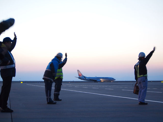 長男と奥さんのグループは、幸運にも「航空機見送り体験」をゲット。地上でグランドスタッフの方たちと一緒に、駐機場から出発する飛行機に手を振って、お見送りの体験をしたそうです。