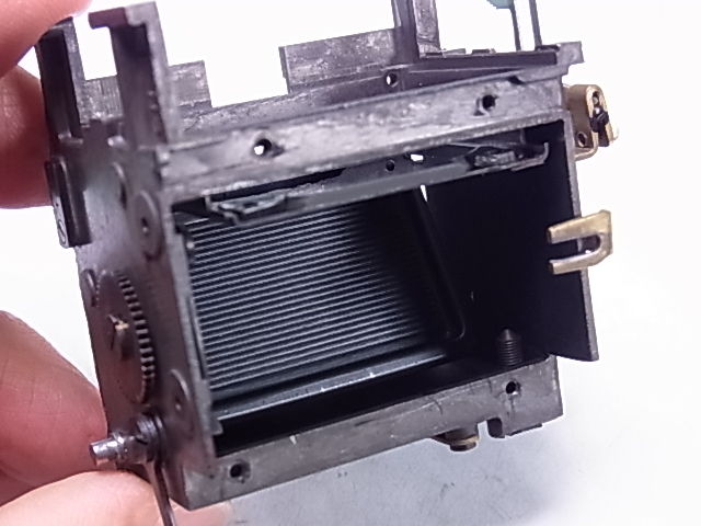 ペンタプリズムを降ろしたところ。長いメーター指針は定点表示式。