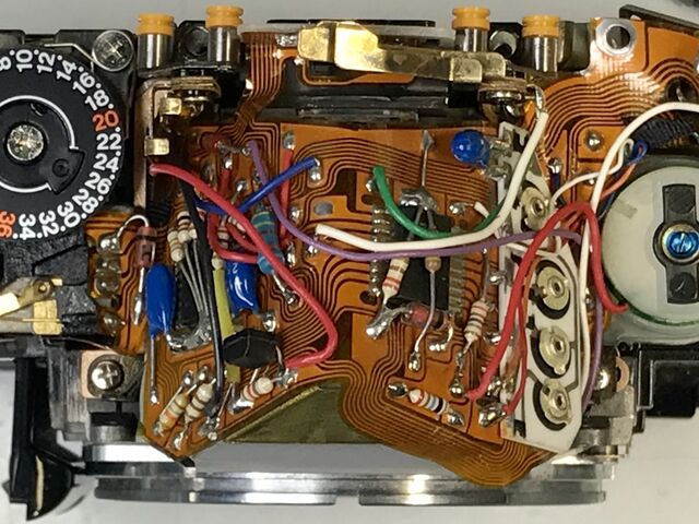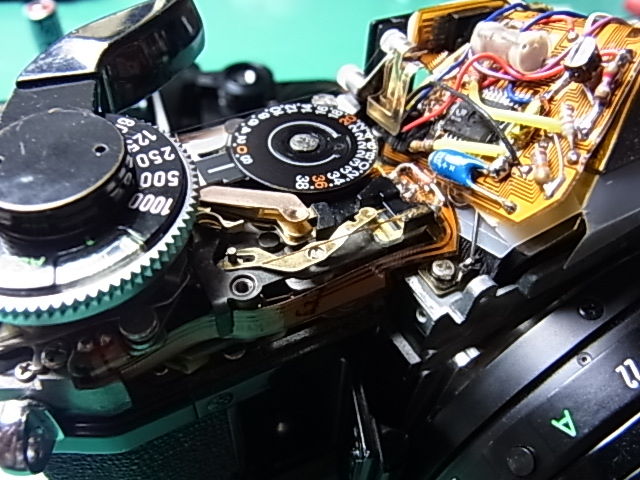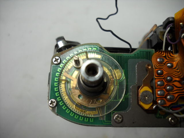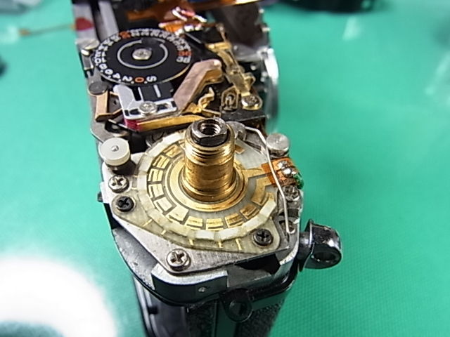 同軸上にスピードと絞りの切換ダイヤルがあり、その基板部が見えています。