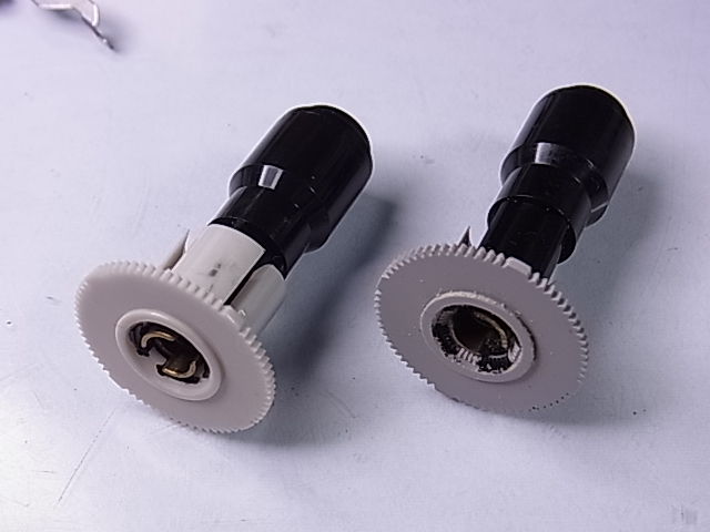 右が不良のスプール。フィルム差込の爪が折れてしまい、ユーザー様が修復を試みた結果、接着剤が軸やその周辺へ回ってしまい不具合を起こした模様です。