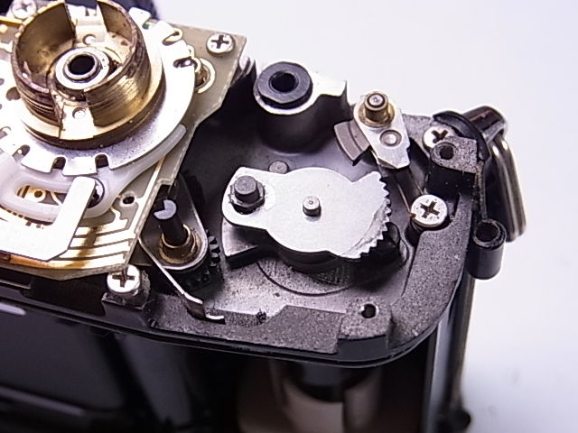 メーターの手前に見えるポールには、レンズからの絞り情報を伝える連動糸の滑車が入ります。