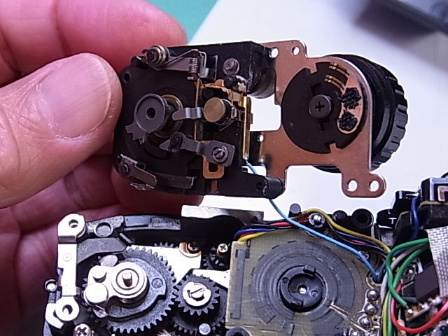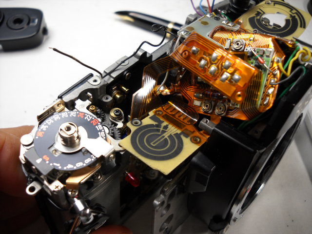 下には巻上げギア部(左)と、シャッターダイヤルのコンタクトシューを受ける摺動抵抗部(右)が見えます。