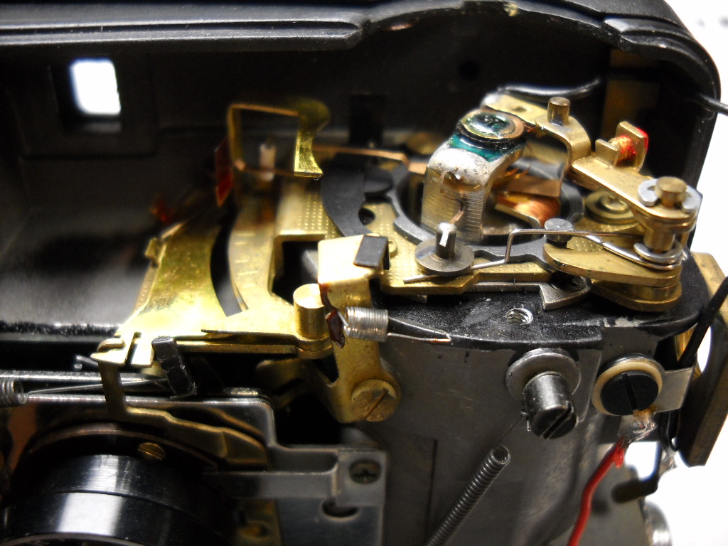 ファインダーを外し、メーター部の指針、針押さえ機構、フィルム感度調整部等を点検します。