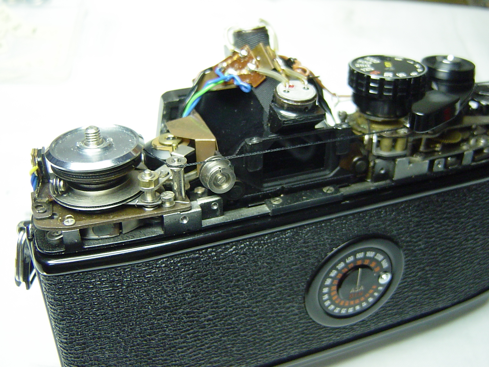 この機種の特徴は露出やフィルム感度、レンズ開放F値等のコントロールを連動糸により行なうメカニズムとなっており、OM-1などもそうですが、糸を切ったりしてしまわないように慎重に作業を進める必要があります。
