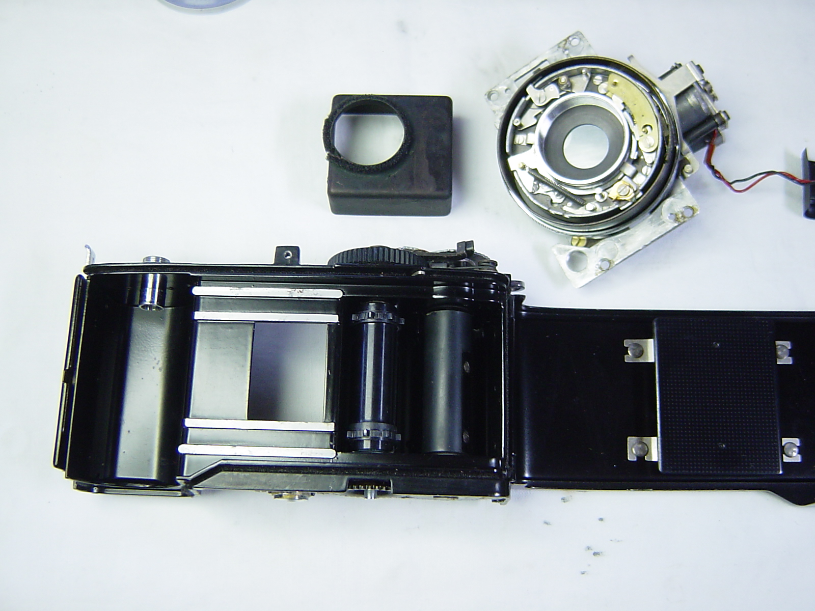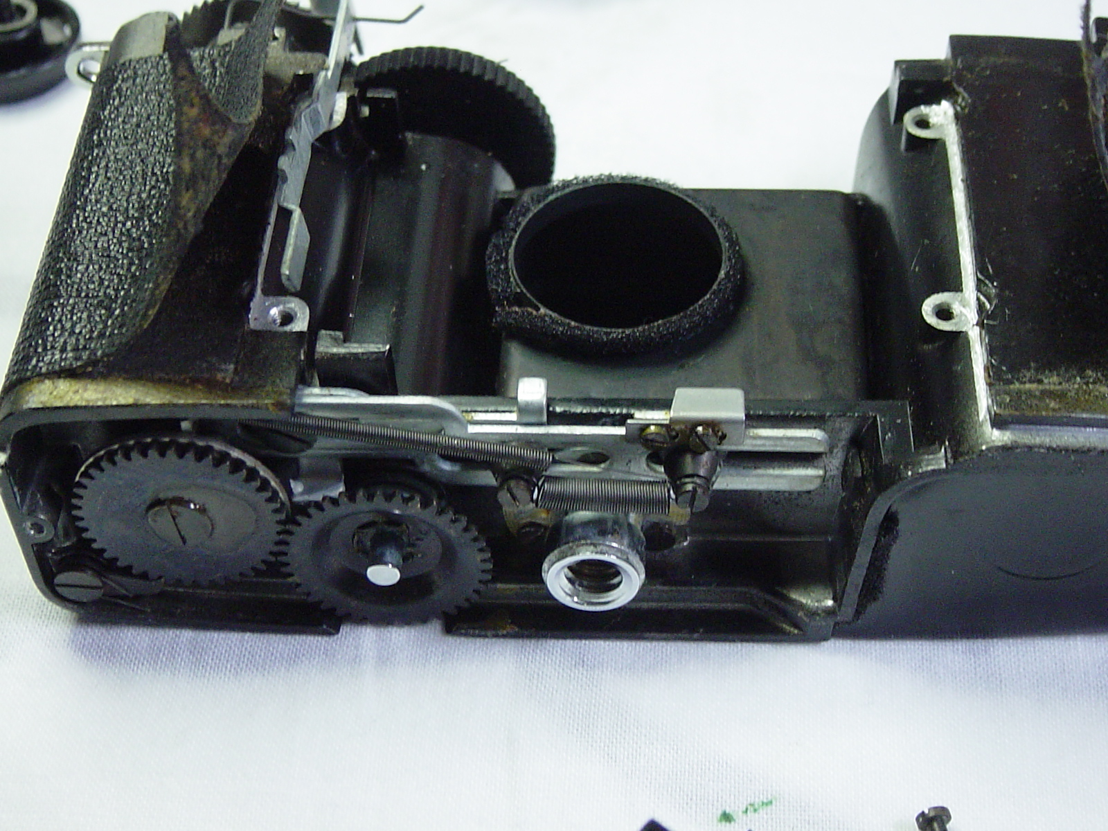 カメラ底部のギヤ類は、巻上げとシャッターチャージの機構です。