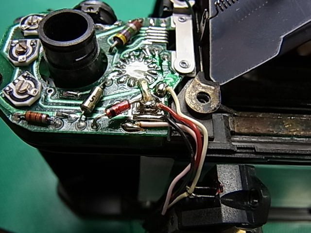 これは露出基板ですね。左側の黒い板状のものが、ファインダー内に見えるLEDの表示部分です。