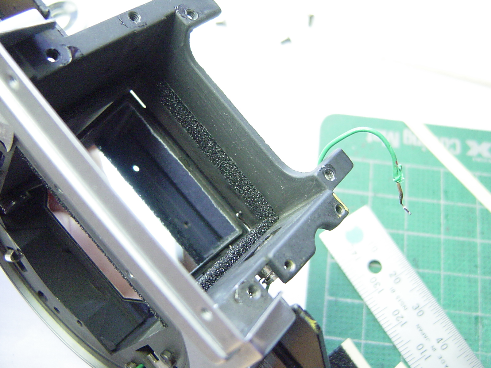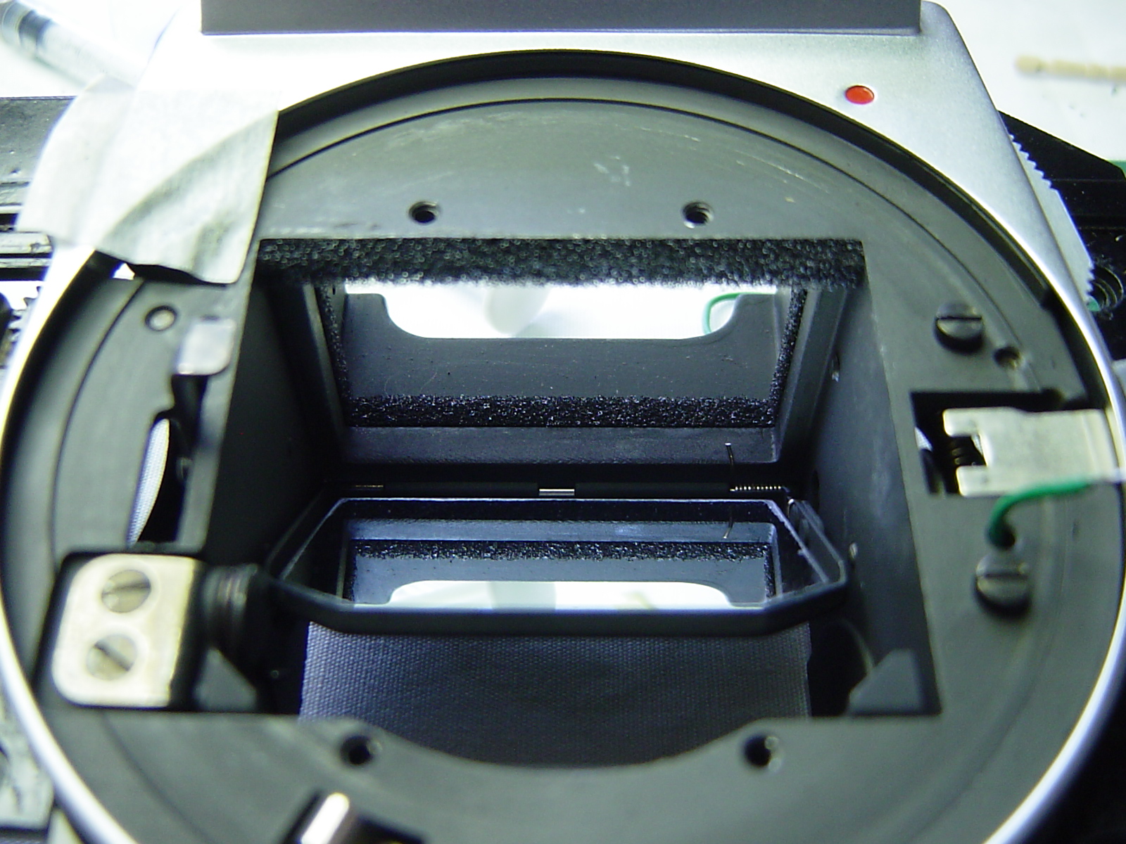 この機種やminolta SRTsuperなどは、フォーカシングスクリーン枠を受けるミラーボックス側にモルトが貼られています。