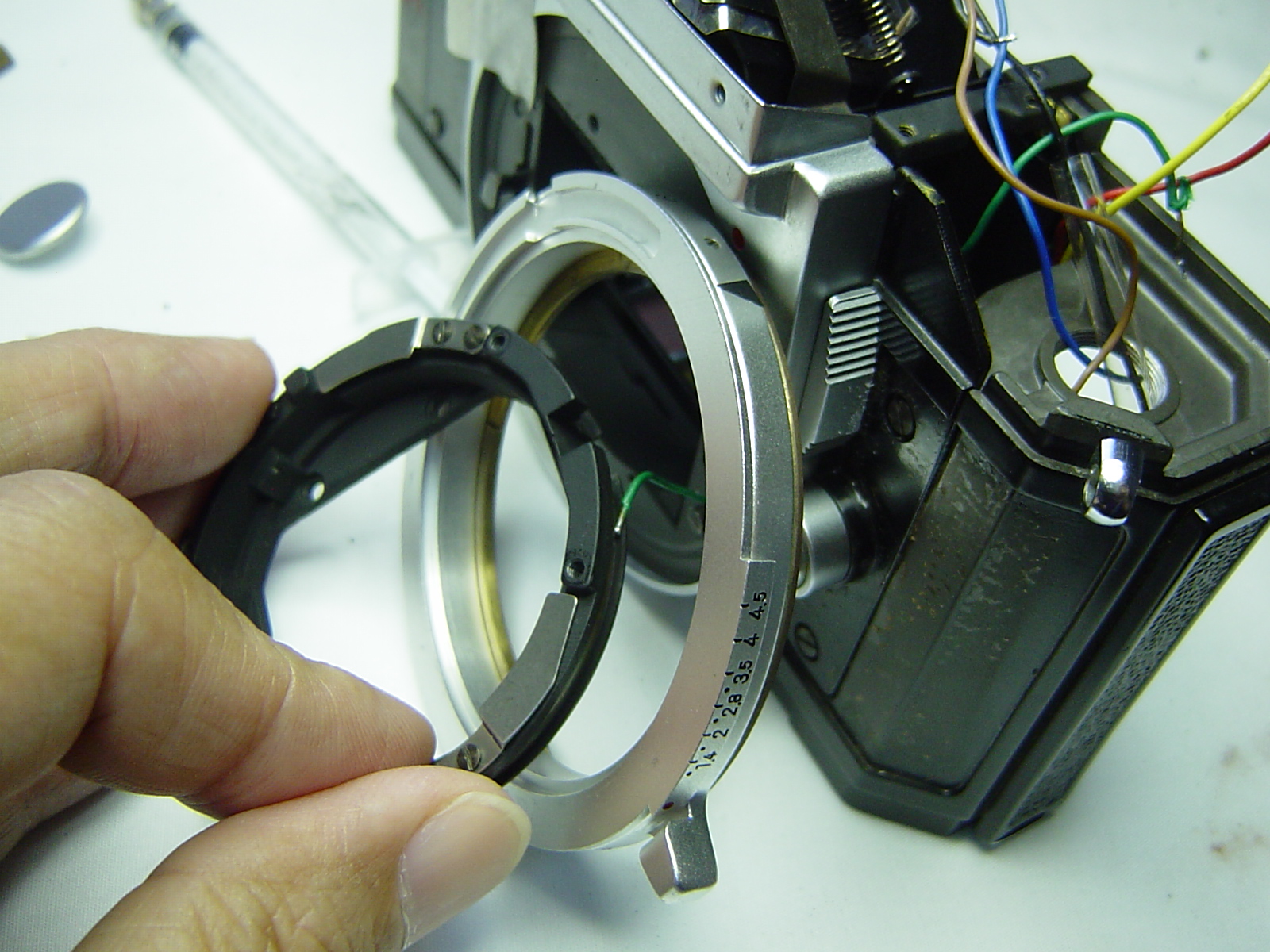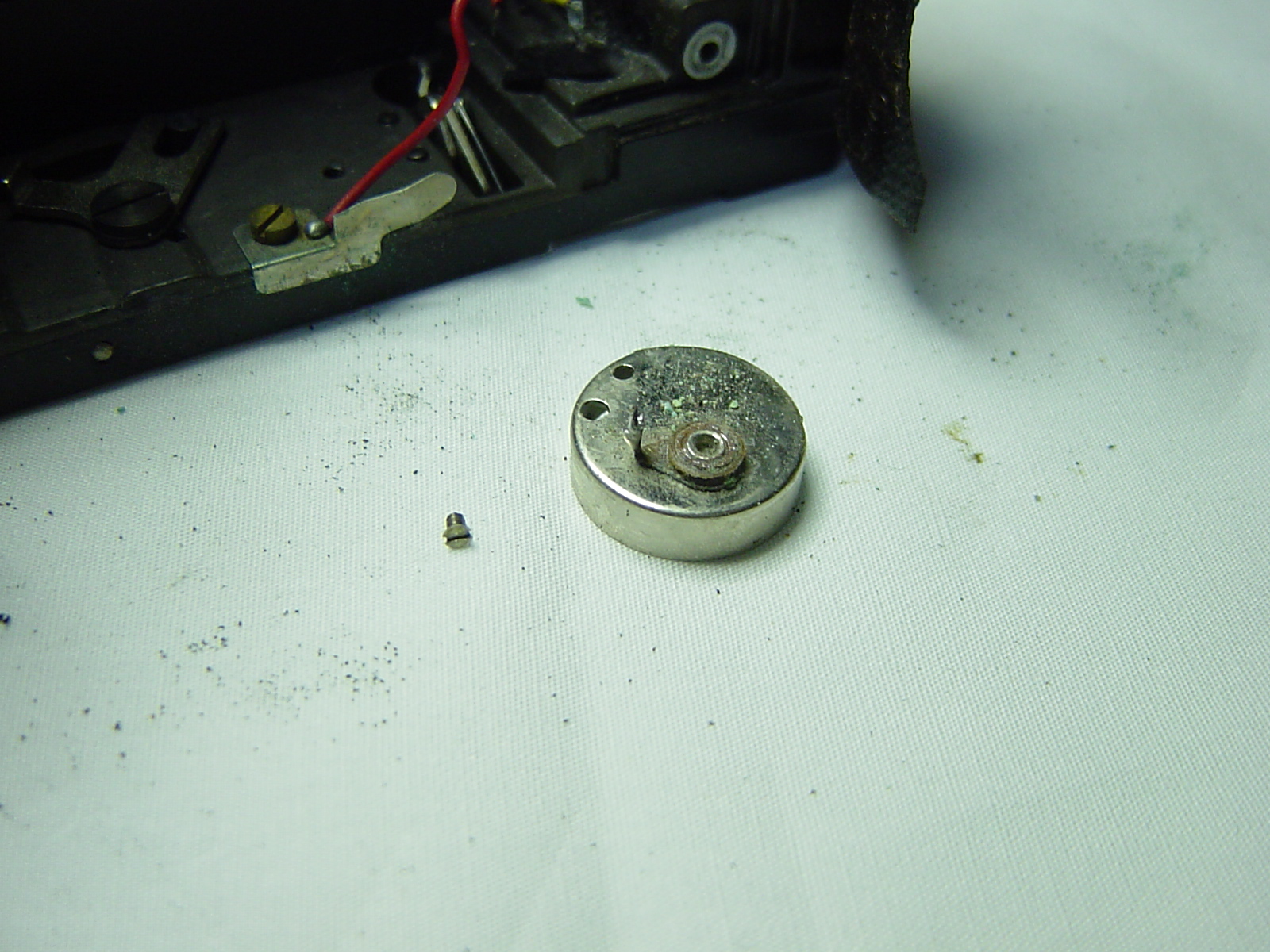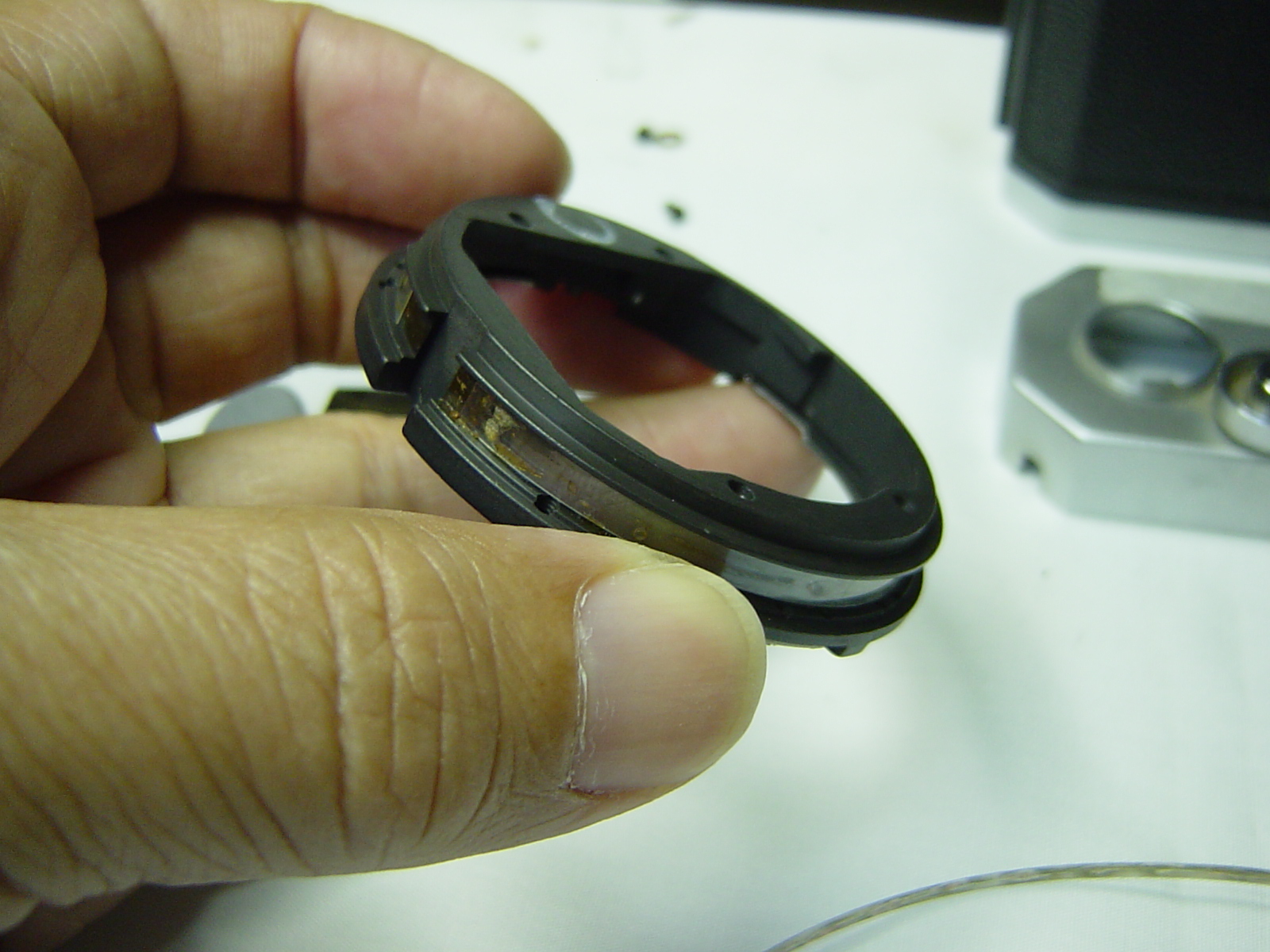 すると・・・・なんと一番内側のリングの外にある、抵抗値をカメラ本体に送る帯状の摺動部がリングから剥がれ、周囲に引っ掛かってグシャグシャになっているではありませんか!