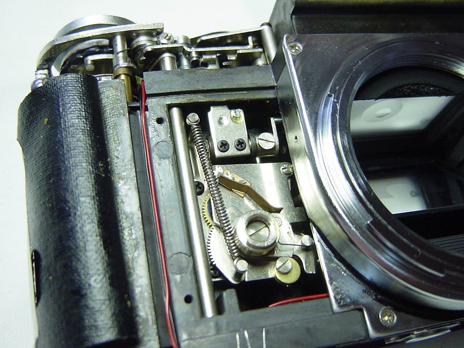 シャッターボタンを1回押すと、ピンやロッド類によりミラーボックスへその動作が送られるのですが、二重写し防止の為にも巻上げが完了するまでシャッターボタンが押せないようにロックが掛かります。
