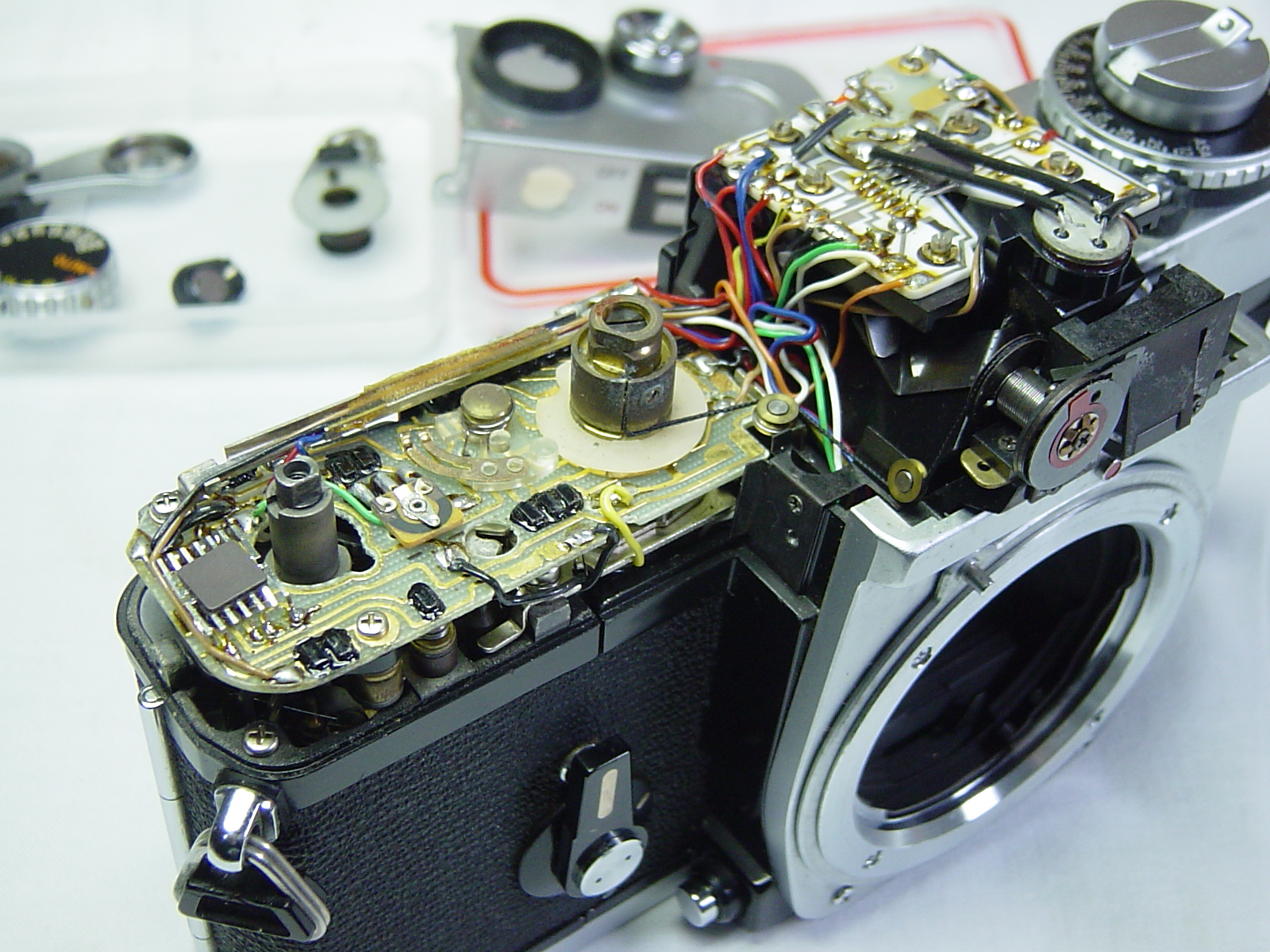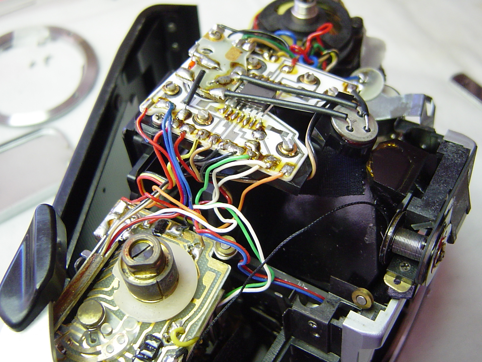 AE露光と、ファインダー内のメーター指針調整、そしてシャッタースピードのコントロールは、このペンタ上の半固定抵抗器と、巻上げレバー付近の抵抗を、バランスを確認しながら調整しました。