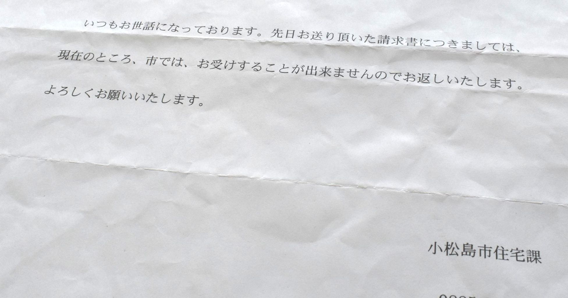 ● 14:49:55 【徳島】台風で木の枝折れ駐車場の車破損、小松島市中郷町の市営団地 市、修理費負担撤回 「市は責任を取ってほしい」 カテゴリ: 事故・事件 1: 樽悶 ★ 後部ガラスが割れた軽ワゴン車 小松島市が返送した請求書に添えられていた書面 9月の台風21号の影響で徳島県小松島市営団地の樹木の枝が折れて駐車場の車が破損した際、当初は市が修理すると所有者らに説明していたにもかかわらず、その後撤回していたことが18日分かった。市は誤解を招いたと非を認めた上で「市に法的責任はなく、費用負担はしない」と主張。市職員の立ち会いを経て修理に取り掛かっていた業者は憤っている。 市などによると、台風21号が県南部に上陸した9月4日、同市中郷町豊ノ本の市営豊ノ本団地の駐車場に止まっていた軽ワゴン車2台に樹木の枝が折れて当たり、後部ガラスが割れたり、車体に傷が付いたりした。 車を所有、使用していた住民2人が市に連絡。訪れた市住宅課職員から「修理とレンタカーの費用は負担する」などと説明を受けた。このため警察や損害保険会社には連絡しなかった。 翌5日、2人から依頼を受けた市内の自動車修理会社で、市職員ら立ち会いの下、破損部分を確認。同社はレンタカーを2人に貸し出して修理を始め、見積書を市に提出した。 見積書を受け取った市が検討した結果、市が費用を負担する事案に該当しないと判断。同社に修理を中止するよう連絡し、所有者2人に負担しない旨を伝えた。納得できない同社は市に修理代とレンタカー代計103万8671円の請求書を郵送したが「お受けすることが出来ません」という書面と共に返送された。 市住宅課によると、国家賠償法に基づき、市には地震や台風などの大規模災害の賠償義務はないと結論付けたという。 市住宅課の柏木義雅課長は「当初、市の免責条件などを十分把握せず、期待させる回答をしてしまった。ただ、見積書を出す前に修理を始められると対応のしようがない」と釈明した。 所有者の女性は「市の説明を信じて修理を依頼したのに」と困惑している。修理会社の社長(71)は「市が費用を払ってくれるのか何度も確認し、信用していた。修理の途中で説明を撤回されて裏切られたような気持ちだ。市は責任を取ってほしい」と怒りをあらわにしている。 徳島新聞 10/19 12:00 http://www.topics.or.jp/articles/-/114184