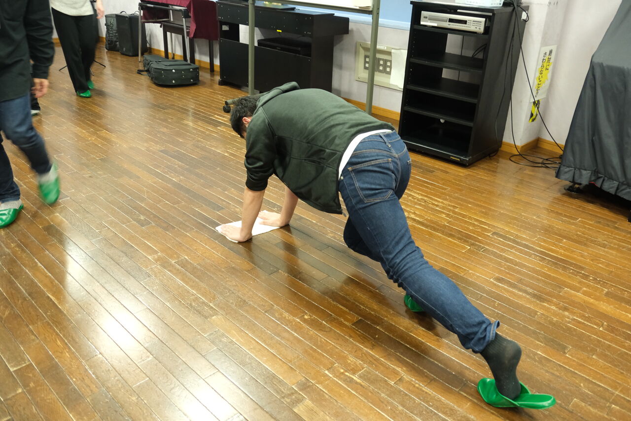 いつもお世話になっている練習会場を、今日は雑巾がけしてみちゃう水野氏