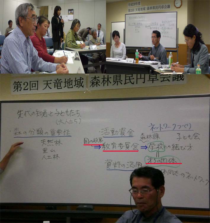 森林環境教育「先代の知恵と子供たち」をテーマとして 第2回天竜地域森林県民円卓会議が10月23日に浜松まちづくりセンターで行われました。ゲストスピーカーとして「TENKOMORI」と「NPO法人ラブネーチャーズ」の二つの団体の代表においでいただき森林環境教育の推移と討論がおこなわれました。わが国の第一の教育を「家庭」第二の教育を「学校」第三の教育を「地域社会と位置づけるならば、二つに団体の「森林環境教育活動」は、第三の教育に位置して素晴らしい教育である事が理解されました。しかし、わが国では、平成19年6月に「環境立国戦略」が閣議決定され中教審においても「学校教育における環境教育の意義と役割」21世紀環境教育プラン 改正教育基本法「環境保全に対する態度を養うこと」が規定されているにもかかわらず第二の教育「学校=教育委員会」との熟成の違いと言う問題点を発見した。第三の教育団体=○=市森林課=×=教育委員会=?=国&文科省と言うネットワーク的課題を見出した。また、Y県民委員より同じ伐採行為でも「自然林」と「人工林」では、伐採行為の極端に言うと「善悪」が異なる。従って、森林環境教育を推進するに伴い特に第二の教育「学校」関係者に明確化の知識向上の教育が必要では、と述べた。(写真黒板参照)参考例とし「武道の必修科目化」が中教審(当時の会長の鳥居泰彦 慶応義塾大学元塾長)により決定し平成23年実施に向け8億の準備費をつけている。(文部科学省課長の鬼澤佳弘氏の談)しかし、現場の教師は、忙しさと指示が明確に受けていないのが現状であり環境教育も同様ではないかと参考意見が述べられた。「教育には、金がかかる!金をかけないと愚鈍な国民が増えもっと金がかかる」