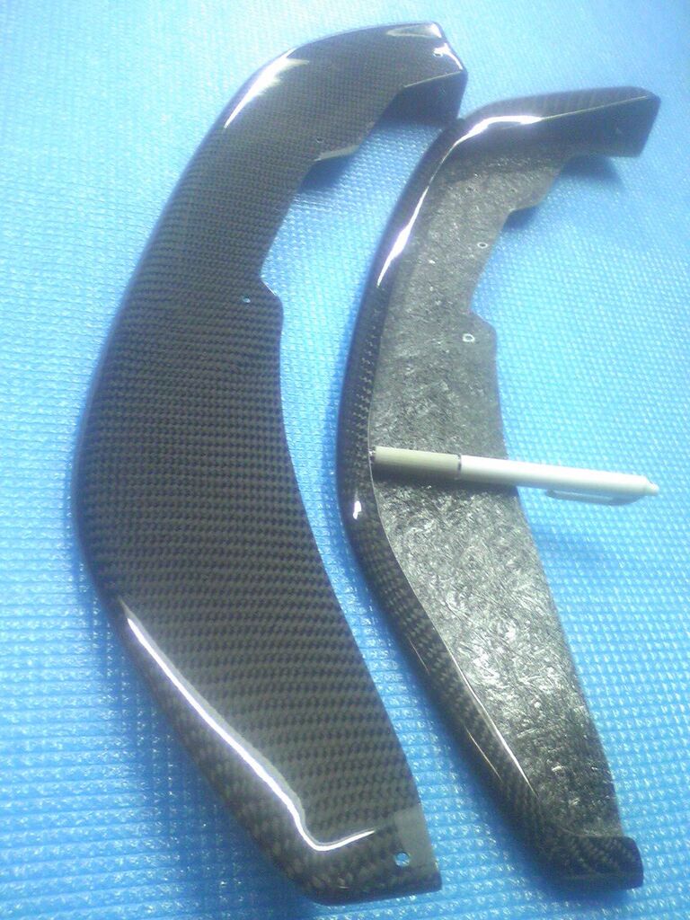 昔ショップさんに納品に行った時の事ですが、どうやって成型しているのか分からないような海外製品を見せられたんですよ。薄いフィンが並んだディフューザー?外観は綺麗なんですが、「ずっしり重い!」裏面には樹脂がゴッテリ。。。メス型にすると狭い、深い、ゲルコートも塗りにくいし、カーボン積層出来る?というようなモノ。後でベテランの知人に聞くと、あれはFRPで製品を作ってのその表面にカーボンを貼り付けて、クリア樹脂を塗り重ねて研ぎ出してあるとのこと。だからFRPより重いよ。。。それにかなりの労力と技能も必要。。。日本じゃ無理。工賃が見合わない・・・らしい。FRPでベースを作る時に丈夫に作らないとカーボンを表層に貼り研磨するときに変形してしまうから裏面に補強を兼ねて厚くしてあるのでは?と想像します。カーボン製品の軽量、高剛性という特性より、見栄え優先!・・・・というより成型方法に無知なデザイナーが考えたカタチを製造工程で苦肉の策として生まれたのかも。。。昔ワンオフの装飾目的で同様な行為をした記憶があります、もう30年以上前の事ですが、、、もっと遡るとハンドメイドのルアーもこうやってバルサにコーティングしてましたね。。
