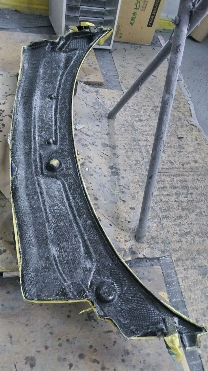 カーボン繊維を一枚貼りで沿わすのに一苦労。更にカーボン繊維をカットする時この方向(柄の見栄えも考慮)でないと追従不可!というシビア条件付き。プリフォーム(繊維を型に設置する)時は将棋のよう・・・繊維の動かせる方向が決まってます。飛車と角のよう。。。微量でも竜や馬になったりはしませんよw。どこからスタート、ここに斜めに寄せ、ここは直線的に・・・ここは目止め、ここは隅から、ここは不動、カットok?、カット厳禁?・・・・カーボン繊維を沿わしていく要領があります。基本、中心部か魅せる部分から始めるのですが、最終の端部で「あれ?数mm足らんけど。。。。スタート時点で少し寄せ過ぎ?」なんてもう最悪の事態