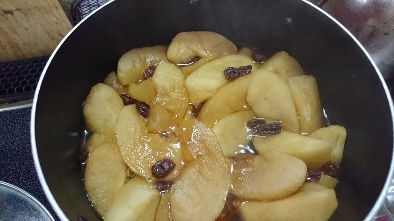 11.煮汁を鍋に戻して、上白糖、レモン汁、ハチミツを入れる。