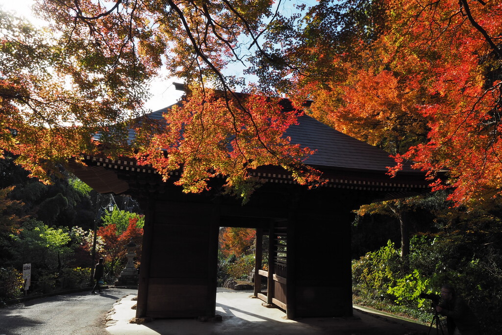 正門の間から見える紅葉は、日本の美しさを醸し出します。
