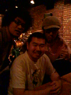 今日は高校の時にいっしょにバンドをやっていた友達で、現在ニューヨークで活躍しているベーシスト、ノリ・ナラオカ(写真中央。左はドラマーの大輔。)のライブに行ってきました。イヤー、気持ちよかったっす。凄いミュージシャンを見るといつも思うのですが楽器が完全に体の一部になってるんですよね。体が楽器にも見えて楽器が体にも見えるんです。ん〜よくわからんけどそんな感じ。あとファンキーミーターズのメンバーでもある黒人ドラマー、ラッセル・バティーステの迫力とスーパーファンキープレイにやられました。後から聞いたのですが、彼はアメリカからスネアもペダルもスティックも何も持ってきてないそうです。ドラム椅子もバーカウンターに置いてある椅子を使ってました。何を使っても自分の音が出せるんでしょう。実際バシッと音が飛び出すような気持ち良すぎる音でした。そしてアンコールの時に一曲ギターで参加させてもらいました。あ〜、本当に気持ちいいライブでした。見逃した方は明日9日の横浜Thmbs Up:TEL045−314−8705 でのライブを。是非、この空間を体験してください!!