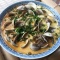 意外にも出張者たちに大好評だったのが、干焼鯧魚。両面を焼いたマナガツオの上に豆板醤や米麹や葱・大蒜などを合わせたソースがたっぷりかかったビビッドな一皿だ。ものすごく辛そうに見えて実際は超ピリ辛で、むしろ米麹の香りと甘さが特徴的という上海らしい料理である。