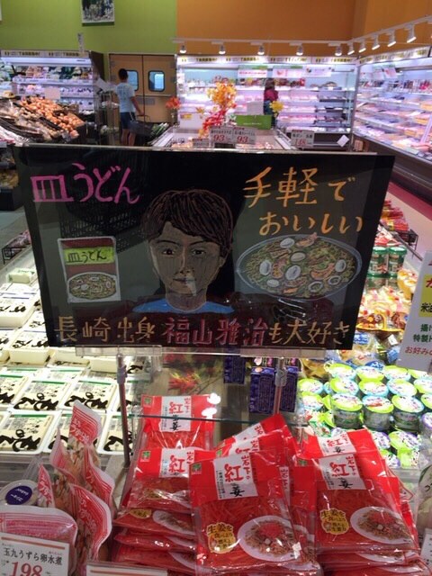 スーパーの食品売り場で福山雅治が「犬好き」と宣伝されている