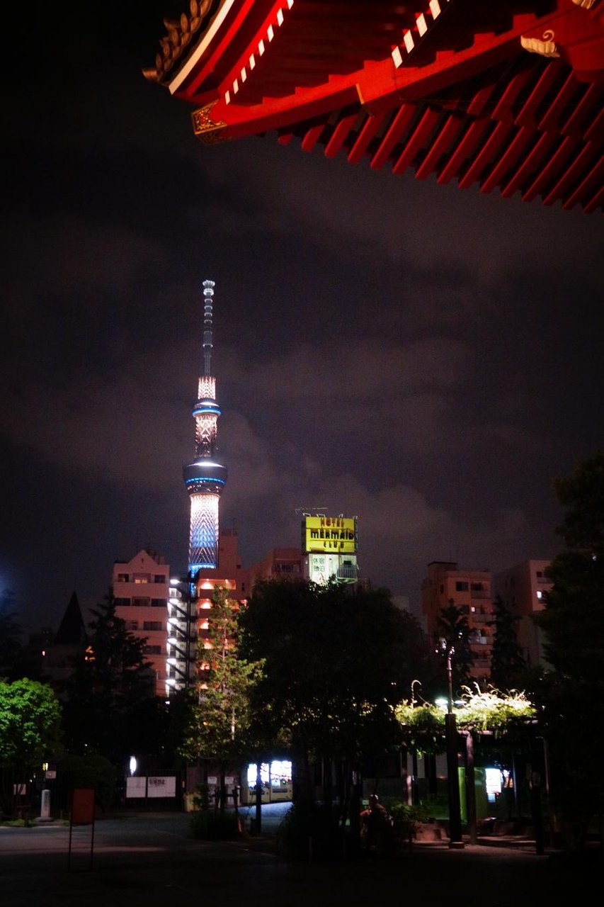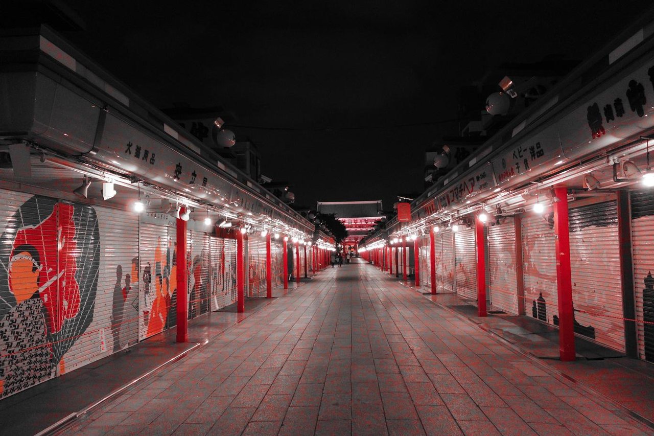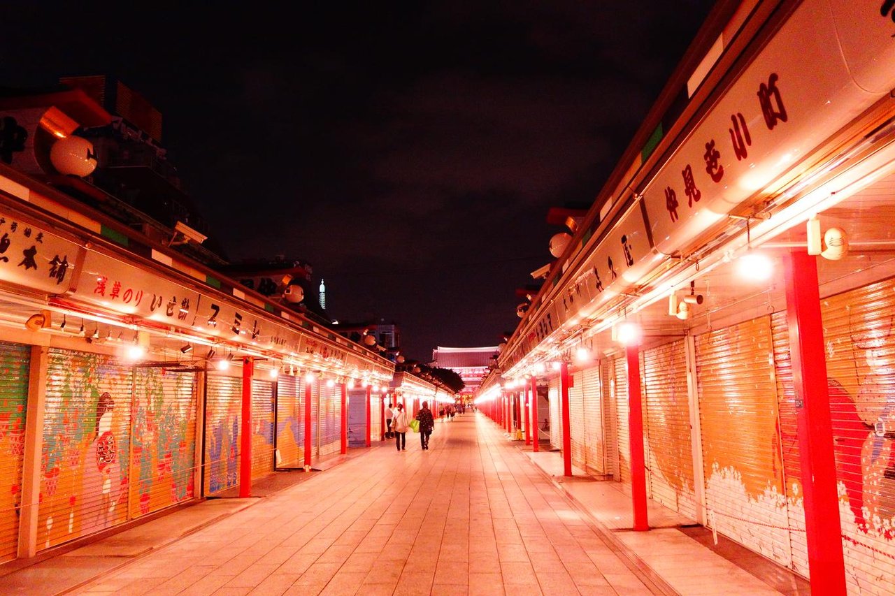 浅草寺までの参道も人はまばらで赤みを帯びたライトアップが印象的です。