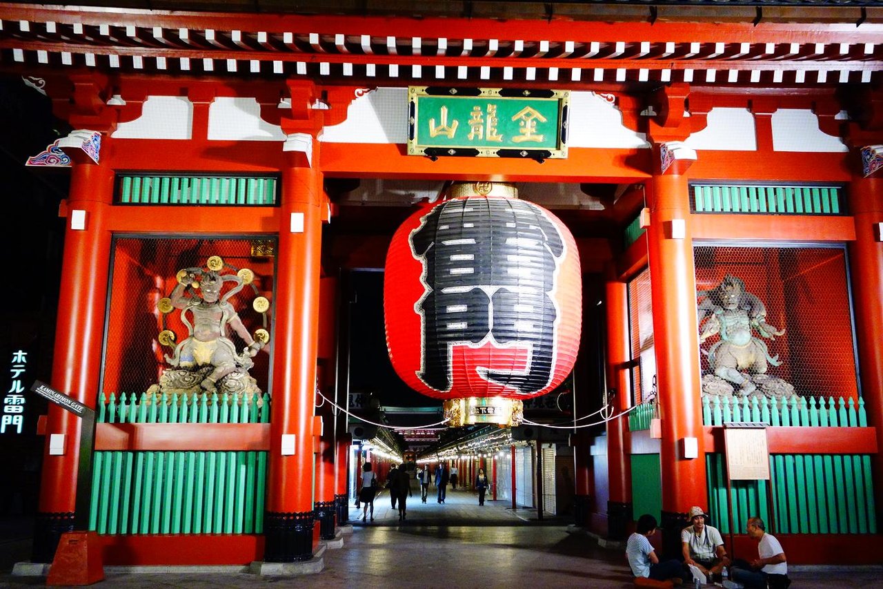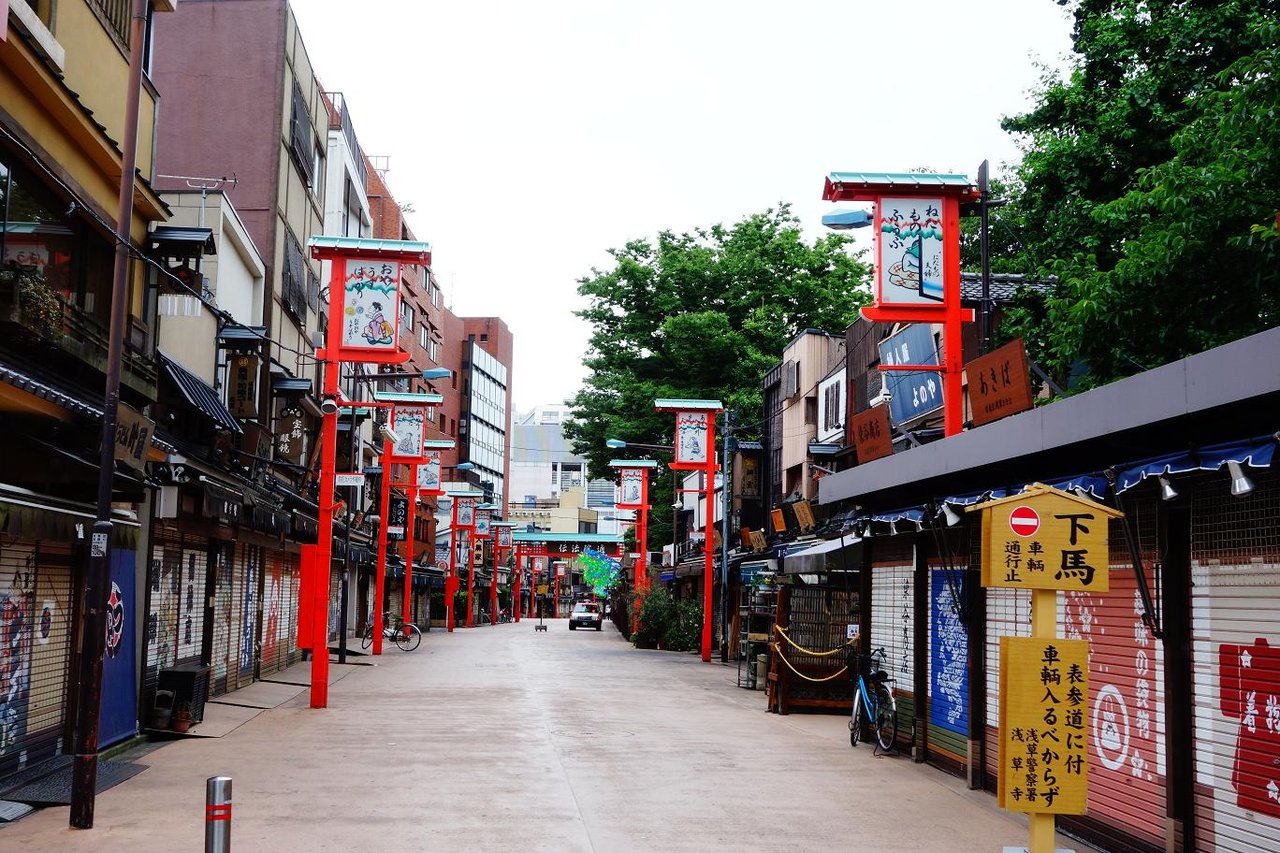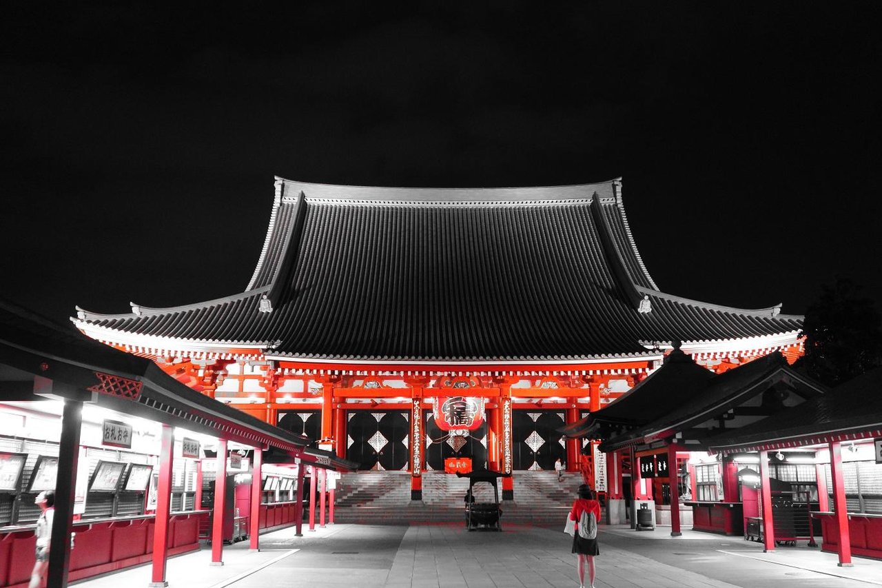 浅草寺までの参道も人はまばらで赤みを帯びたライトアップが印象的です。