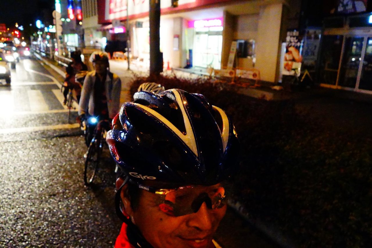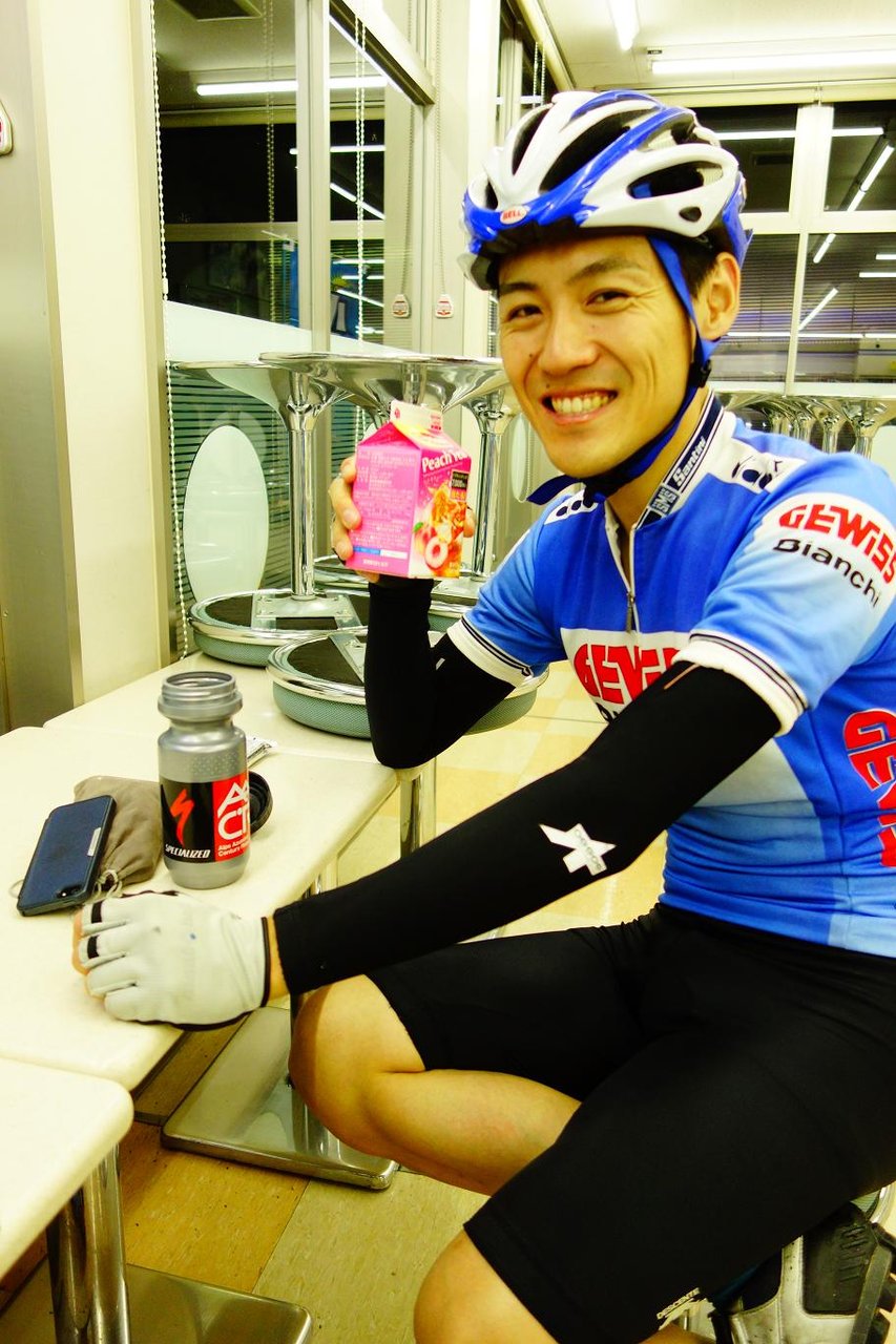 3:20 岐阜県に入り最初のコンビニで休憩です。 ここまで30km、広い濃尾平野の中は殆んどアップダウンも無くY川君もとりあえず元気です。