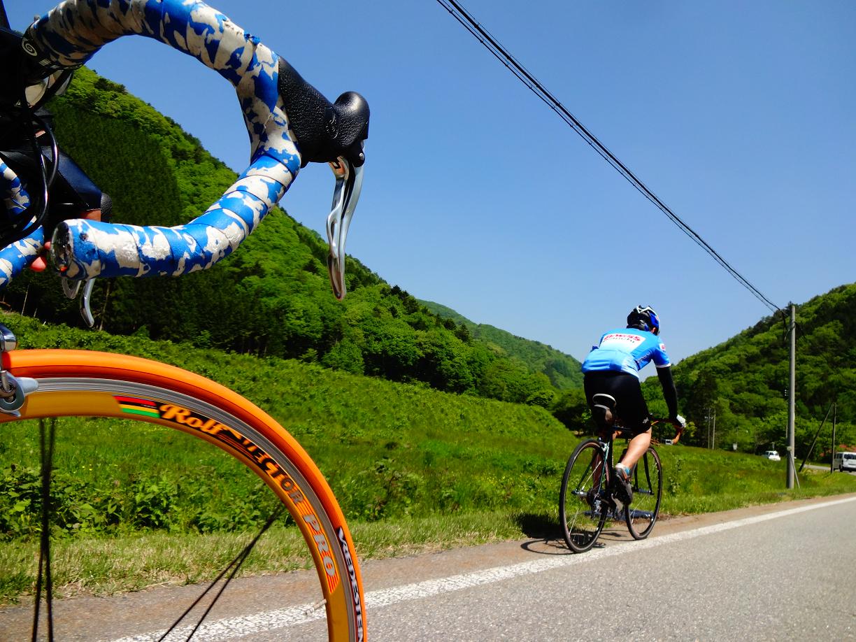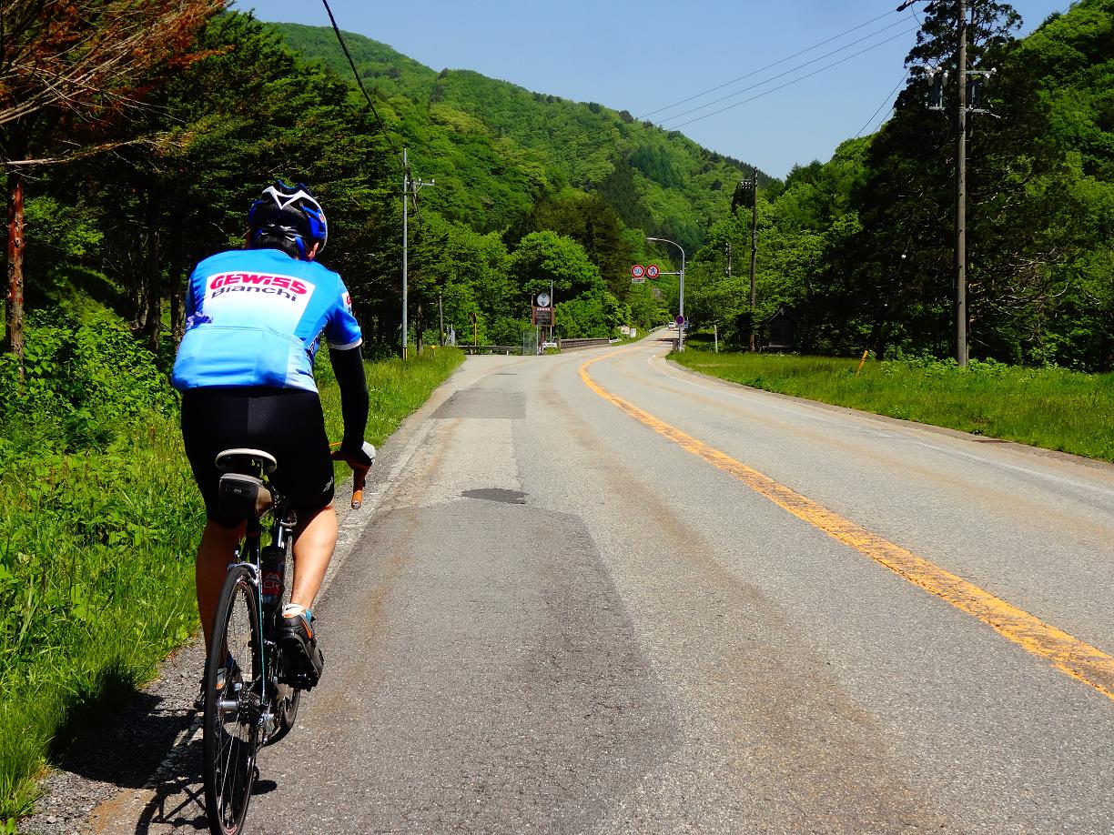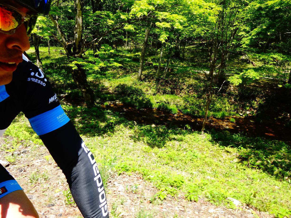 このあたりまで上ってくると「せせらぎ街道」の名前のごとく道路の横には綺麗な小川が流れています。 とまあ写真を撮りながらのんびり走る自分とは対照的に、あと少しでゴールとY川君は燃えて先に行ってしまいました。