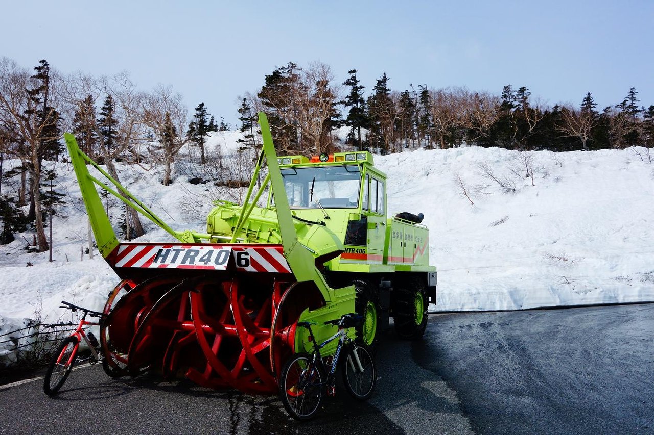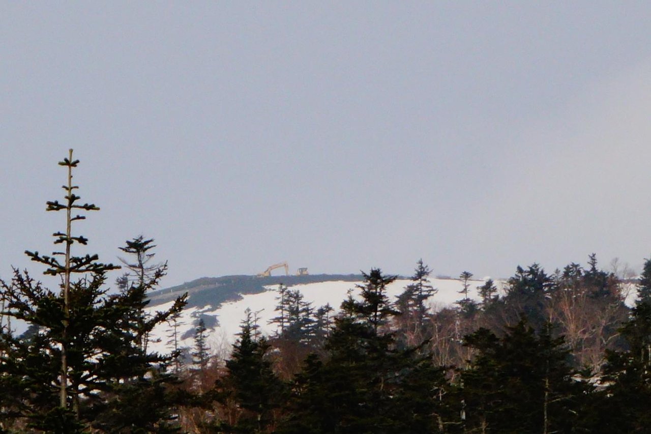 行く手の遥か遠くに見えるブルドーザーからエコーラインの現在の雪かき状況がどこまで進んでいるのかがわかりますが、どう見ても山のピークにいるように見えて場所がイメージできません。 これも後からわかったのですが、ブルドーザーから後方はガスっていてメインの山が見えず、まるでバックが空のように見えていたのでした。またこの位置から見える角度が急なのもありました。 ちなみにこの後ろには富士見岳が構えてます。