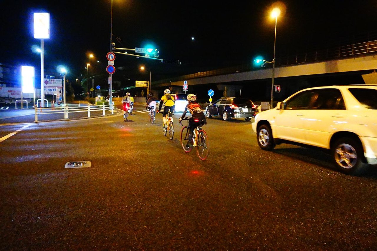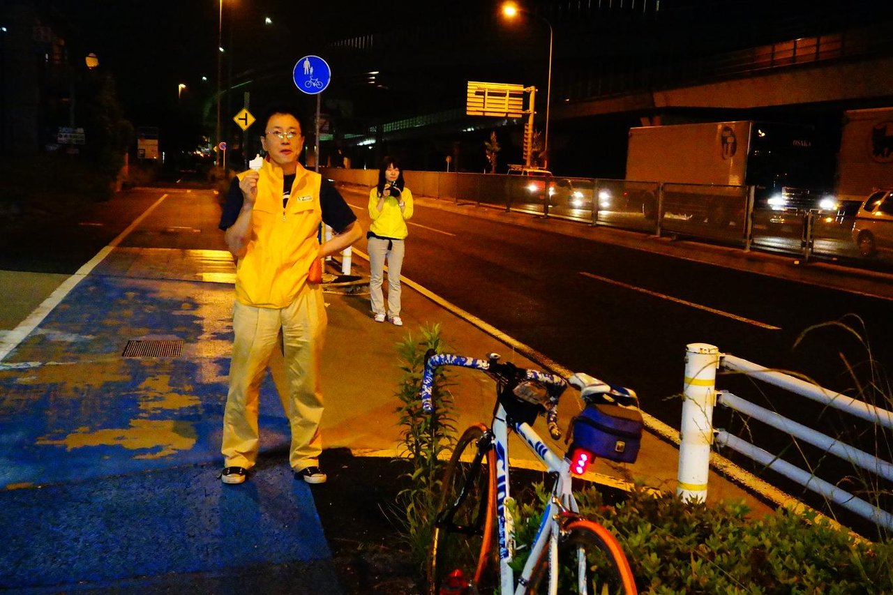 郊外グリーンロードに入ったあたりから車の量も減り、あたりも暗くなりいよいよ深夜ツーリングです。 自分のお役目(先導)はここまで。 皆さん無事残り320kmガンバれよ〜!