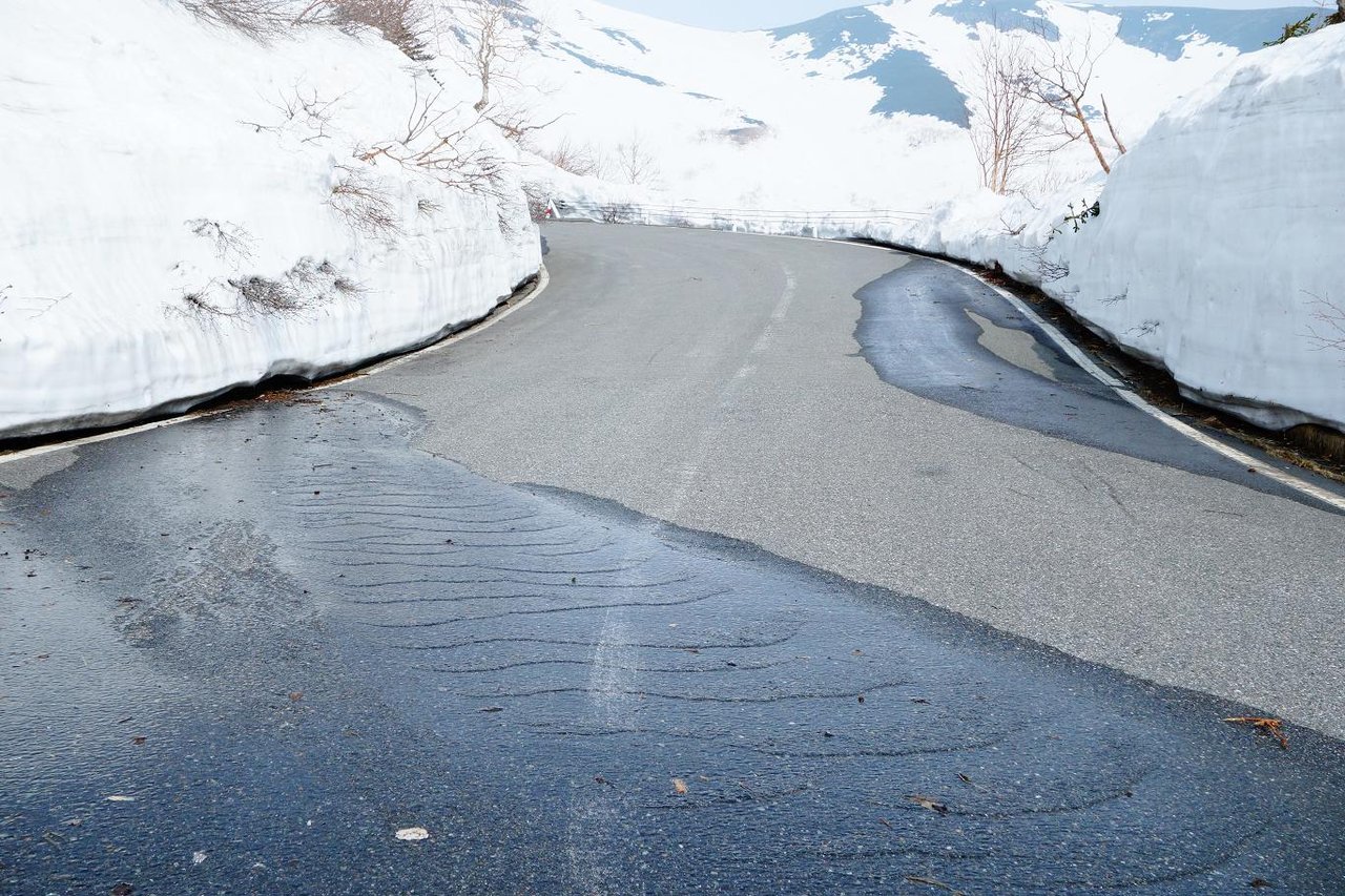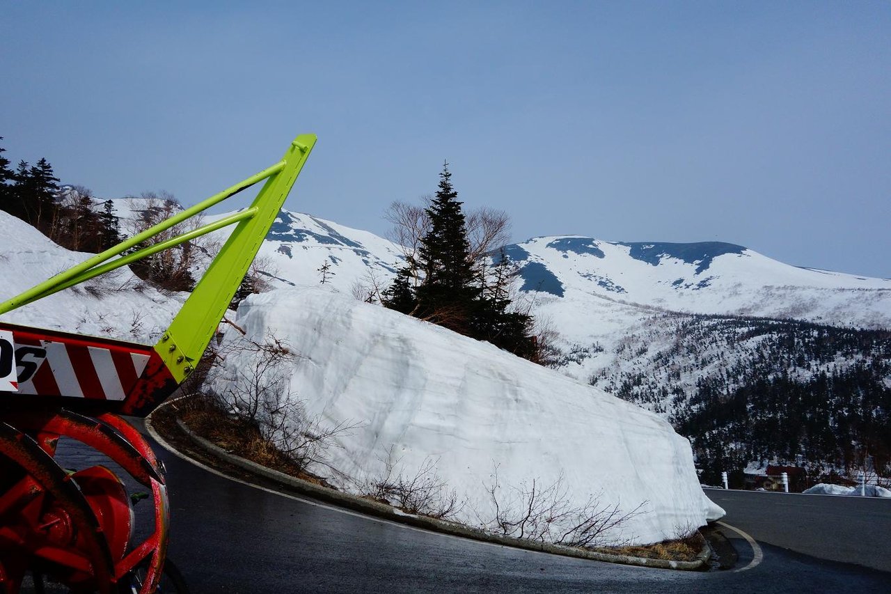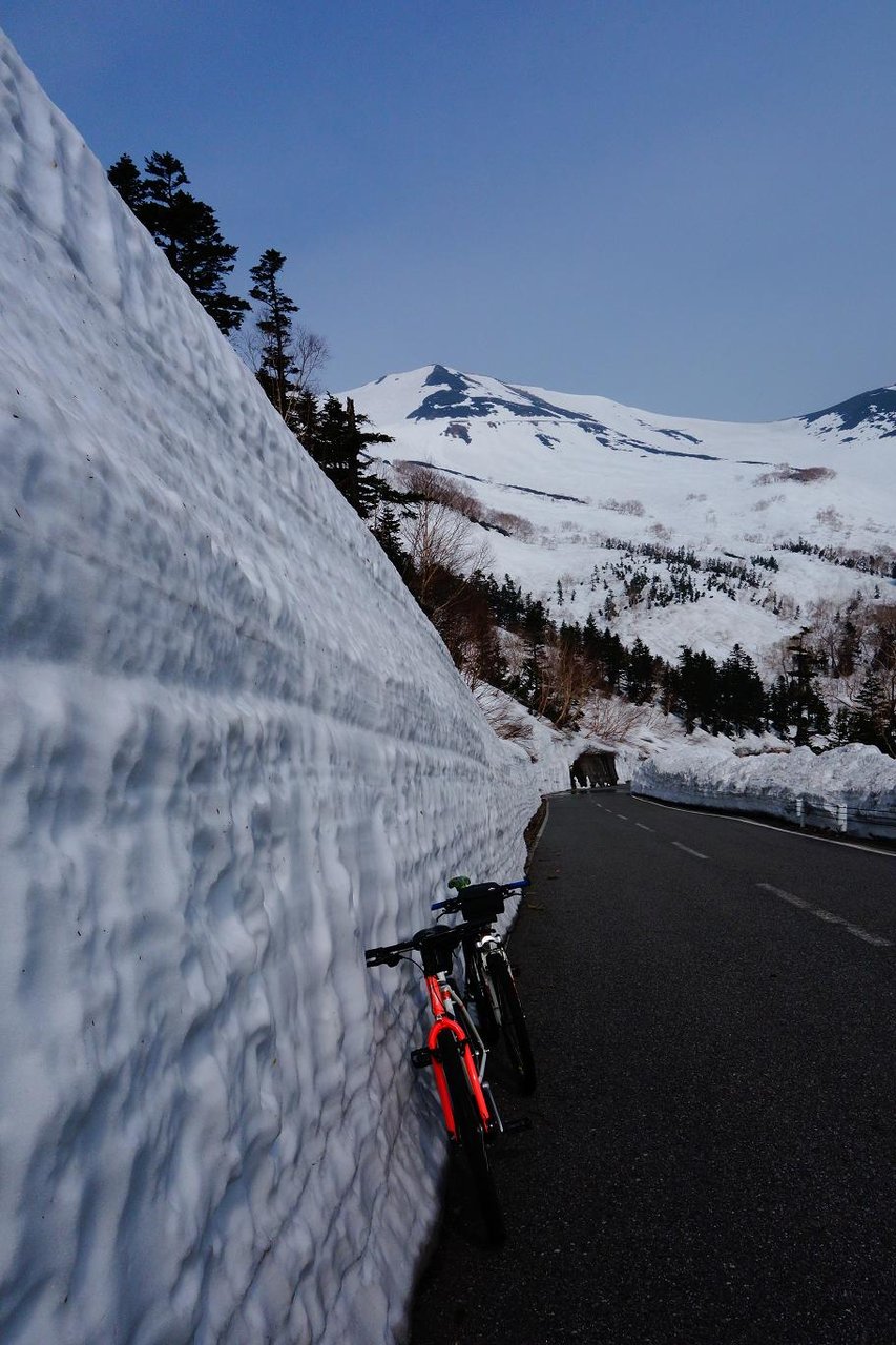 雪の壁〜。前回5月3日に来た時より雪の表面が多少溶けて角が丸くなってますね。