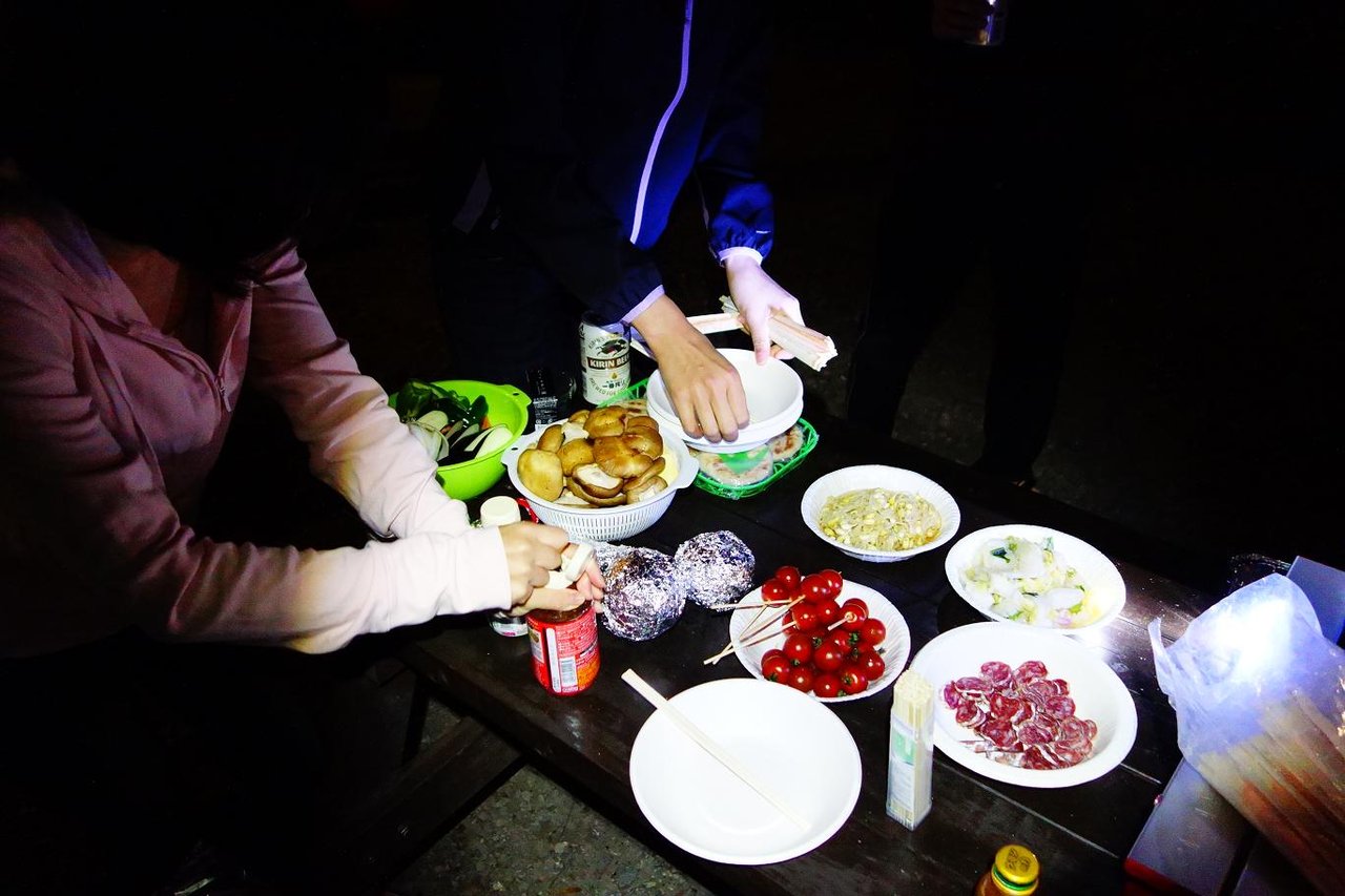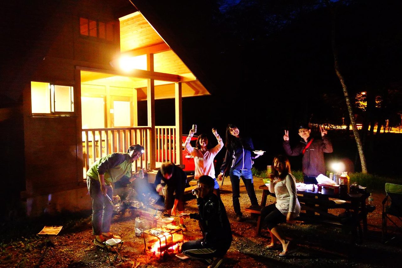 今宵のお宿はコテージでした。 日も翳ってきたので急いで夕食の仕度開始〜。