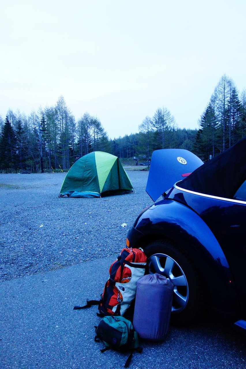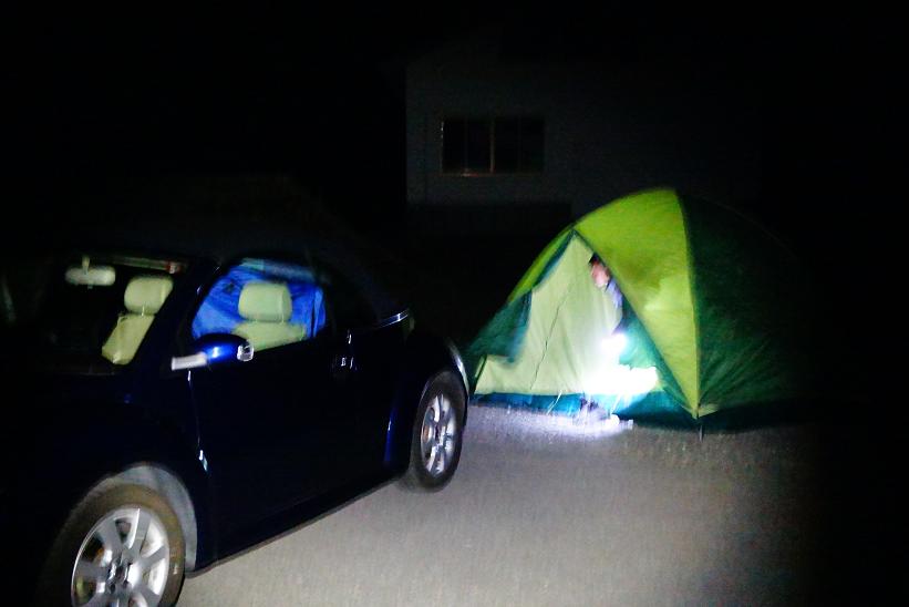 深夜0:00 現地に到着、テントを車の後ろに張って寝る準備をしたら・・・。