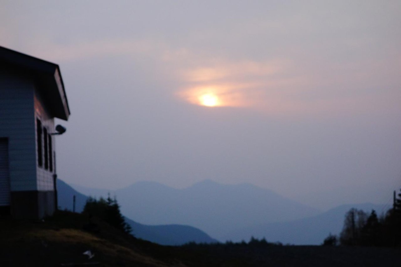 5:00 太陽はすでにこの位置に。今日はガスっているのか朝靄なのか、、、日中青空は拝めるかな?