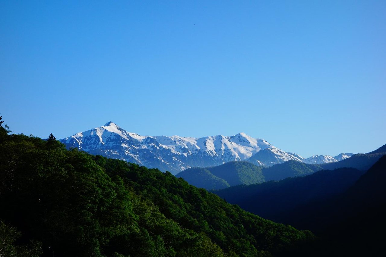 遠くの雪山をズームアップ。多分蝶ヶ岳かな・・・。