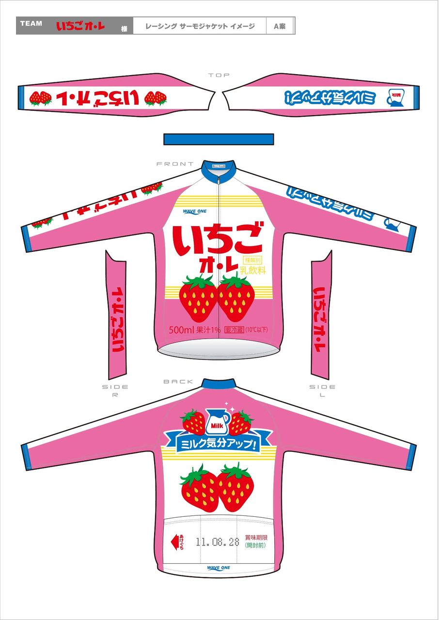 このデザインいいなぁ。「あぁぁぁ〜チームいちごオレの方ですよね〜〜」と声を掛けてみたくなる!自分が着て走るかというと、ちょっと自信ありませんけど。